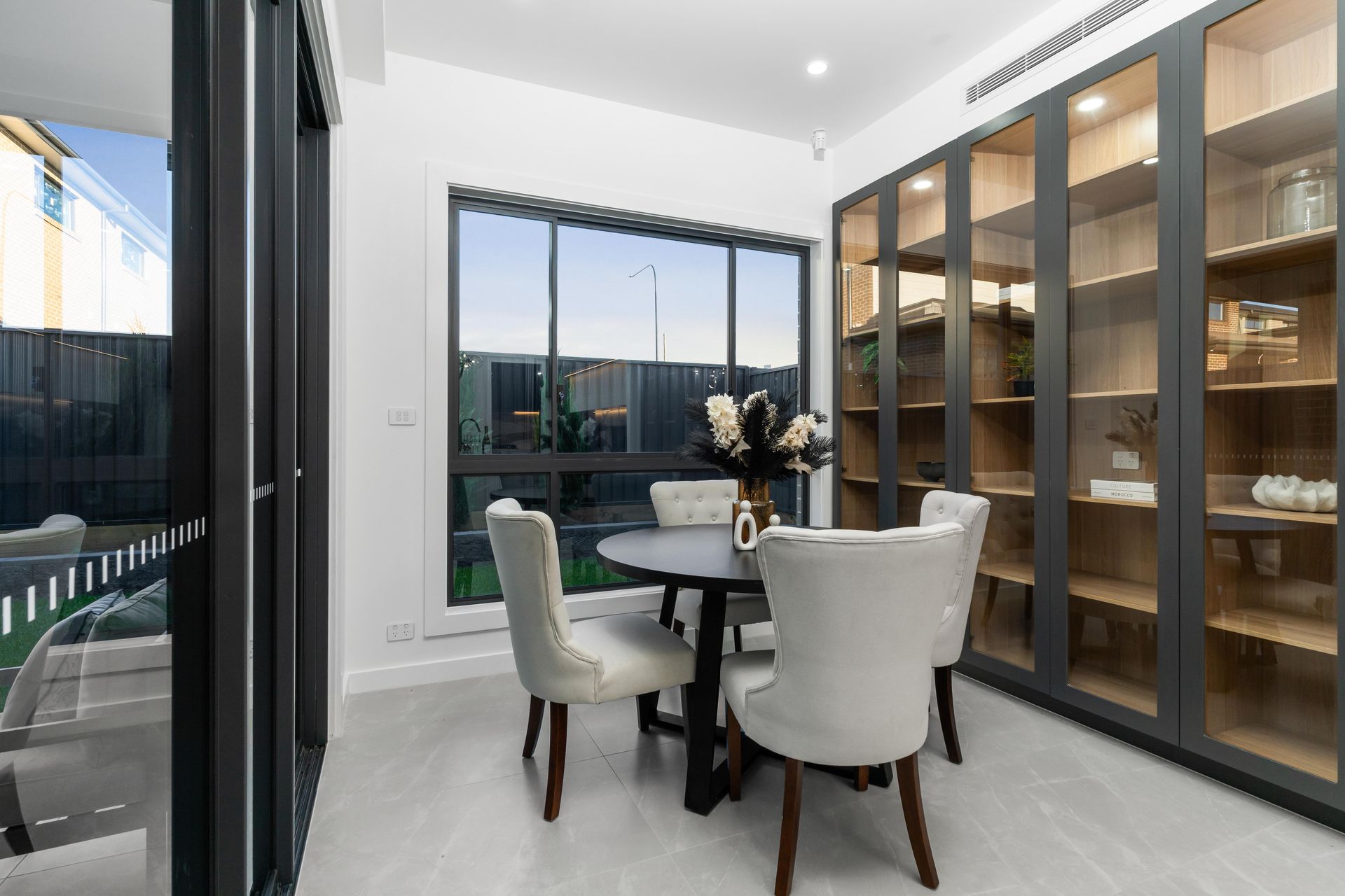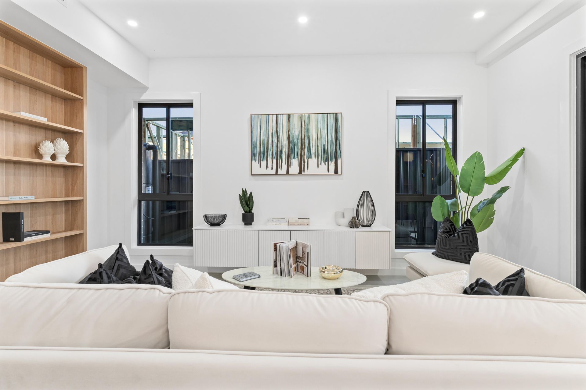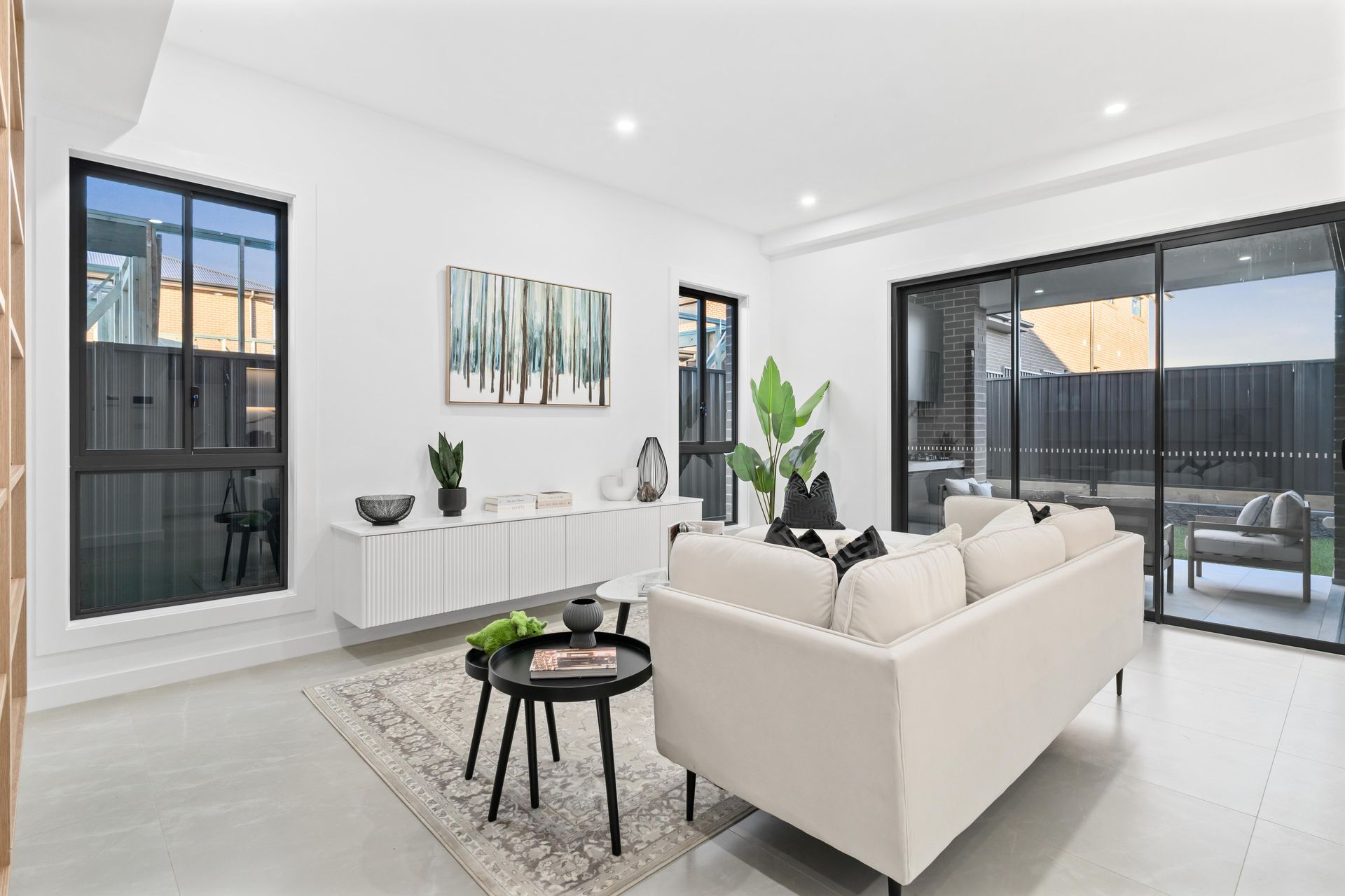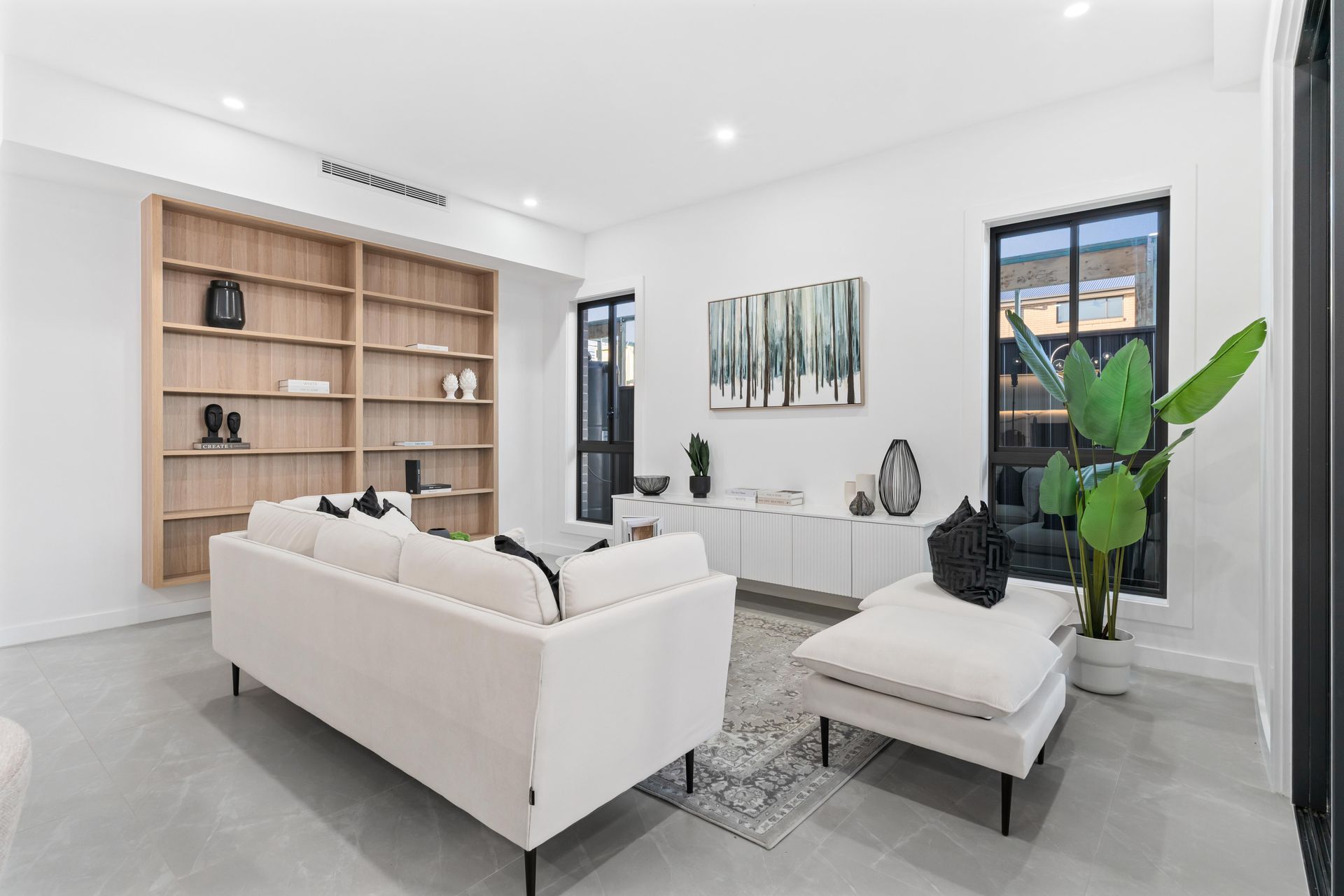 The ground-floor living zone anchored the home. A large ivory sectional sofa sat low against the tiled floor, opening the sight line through the sliding doors to the covered alfresco area beyond. Black geometric cushions and a vintage-wash rug introduced texture without weight. A full-wall timber bookshelf — one of the home's built-in features — was dressed with curated dark accessories: matte ceramics, architectural books, a sculptural vase. Without those objects, the shelf would have read as empty storage. With them, it read as a room someone already lived in.