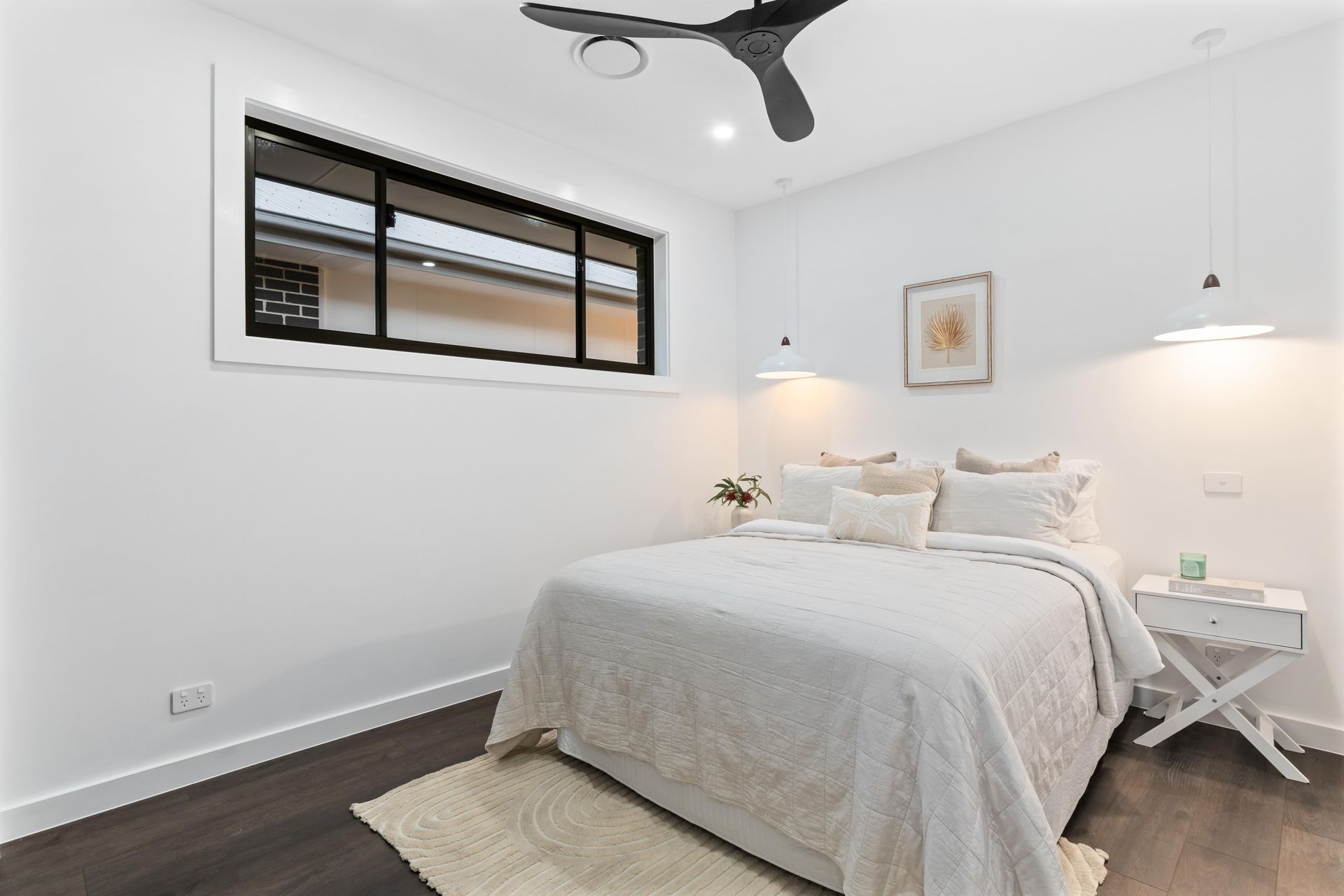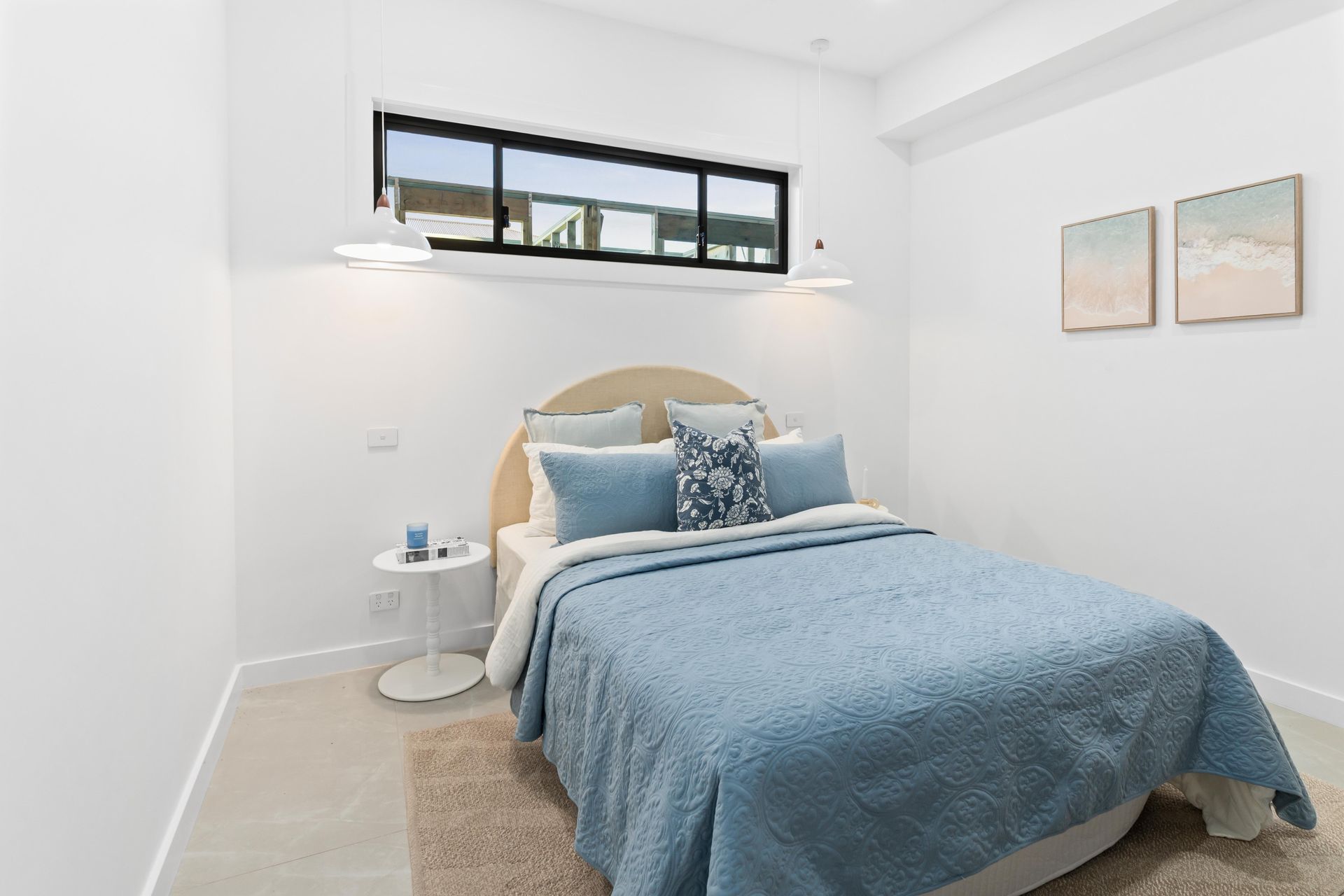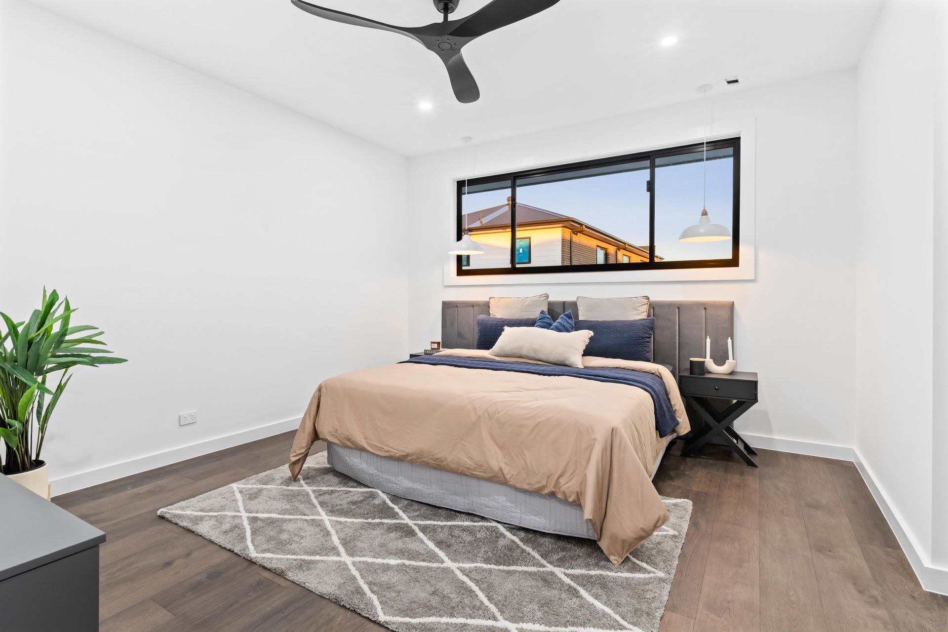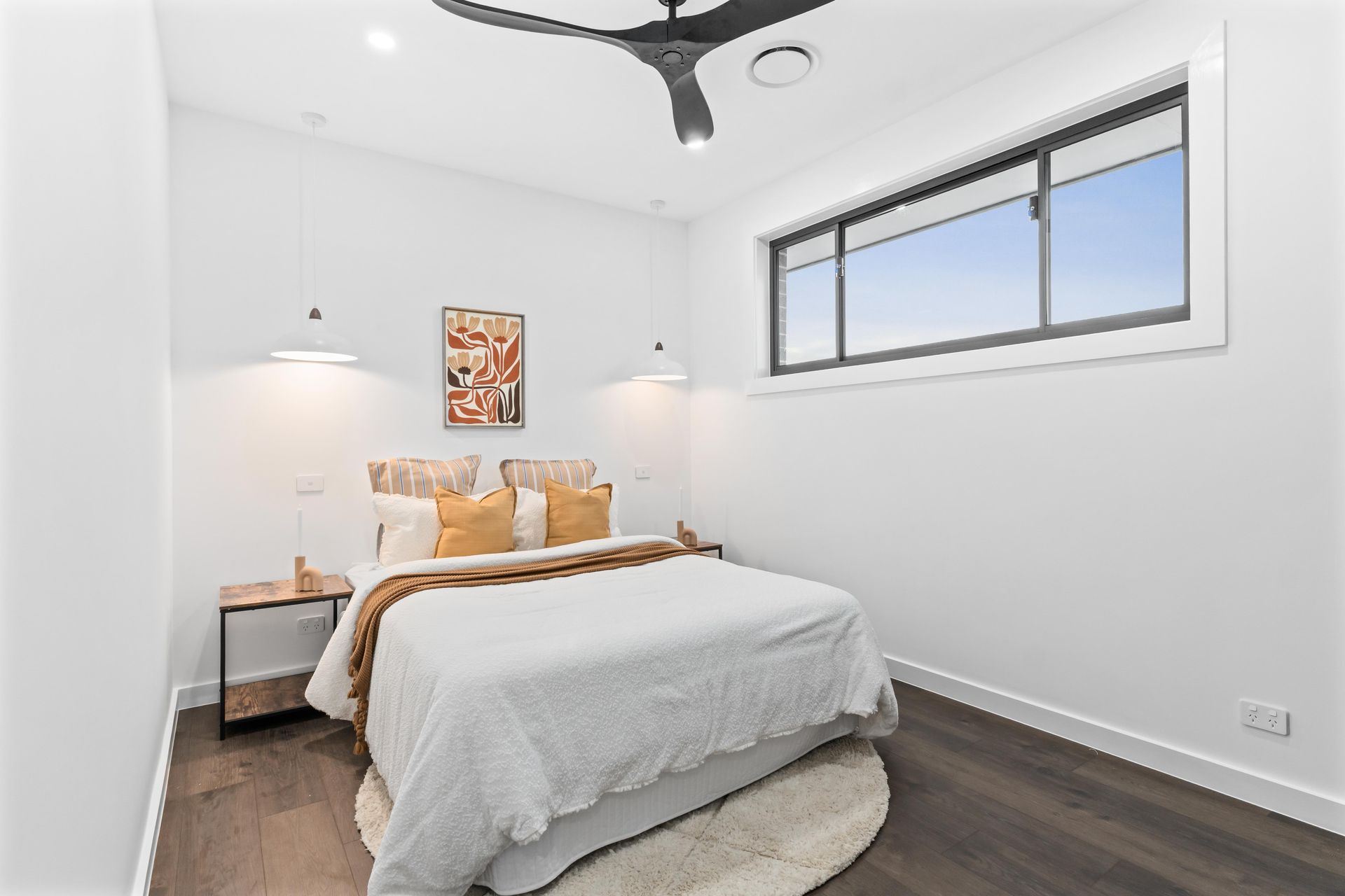 The challenge with a home this size is not just volume. It is differentiation. Five bedrooms staged identically would make the house feel like a display suite. Each room needed its own story. The ground-floor guest bedroom got a coastal palette — soft blue quilted coverlet, round timber headboard, ocean-print artwork — pitched at the downsizer parent or visiting family member. Upstairs, the master bedroom ran darker: a channel-tufted grey headboard, navy and blush layering, geometric rug over dark timber floors, cross-leg nightstands in black. The third bedroom took on warmth — ochre cushions, a rust botanical print, industrial timber-and-metal nightstands. The second bedroom stayed neutral: cream linens, a dried palm frond print, white pendant lights, a textured rug that softened the engineered boards beneath. Four bedrooms, four palettes, four buyer conversations running simultaneously.