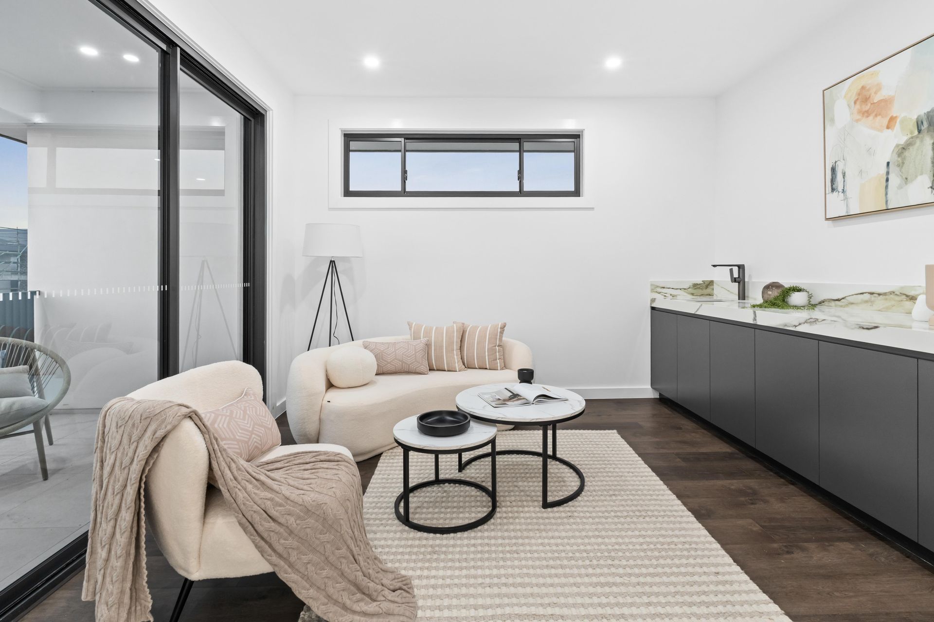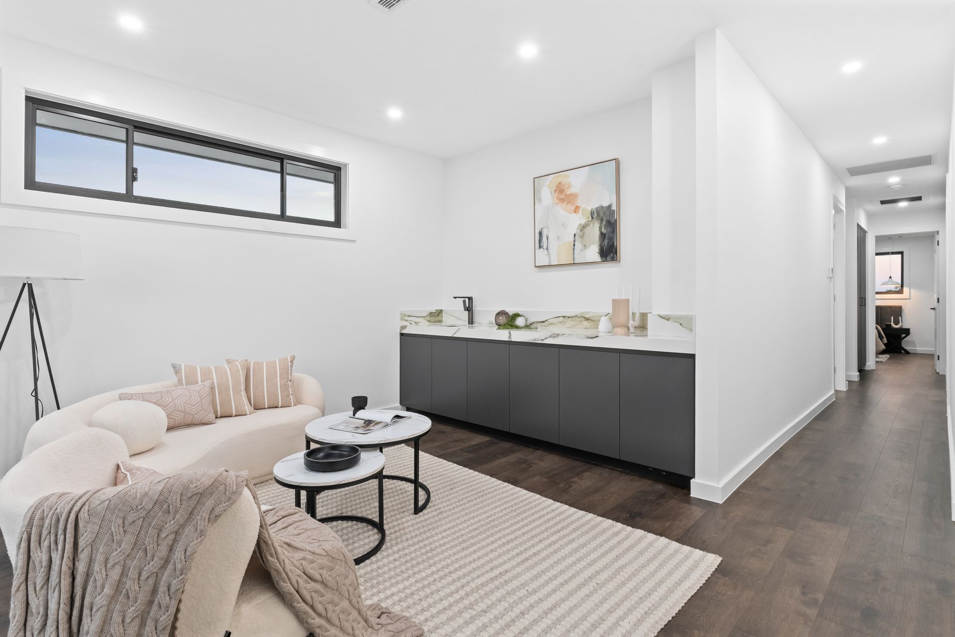 The upper-level retreat posed a different problem. Positioned at the top of the floating staircase, it served as a second living zone with a bar-style dark cabinetry unit topped in green-veined stone. The space was angular, modern, and cool. A curved boucle-style sofa broke the geometry. Blush cushions and a cable-knit throw warmed the palette. Nesting coffee tables — black metal with marble tops — carried the material language of the kitchen upstairs without copying it. A floor lamp and abstract art completed the room. Without staging, this space would have been an empty landing with a wet bar. With it, it became the room every buyer wanted to sit in first.