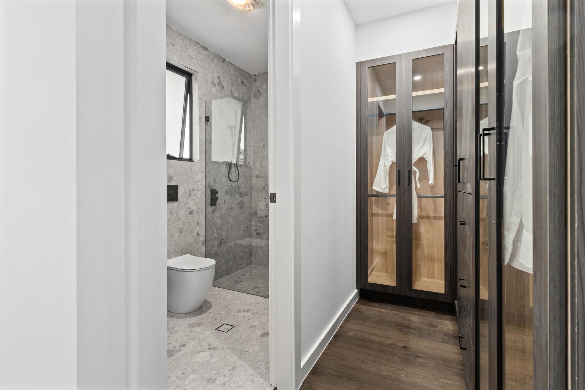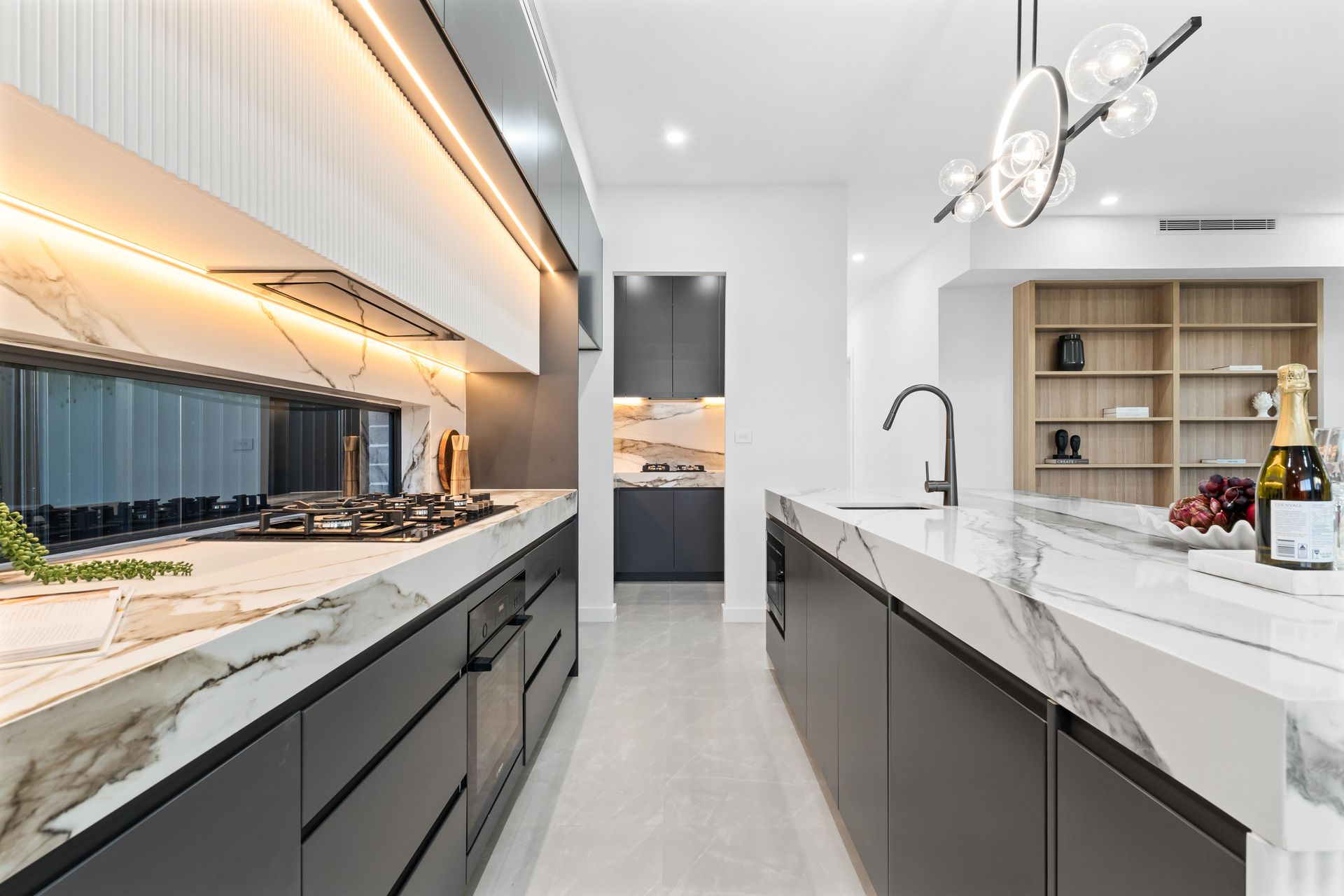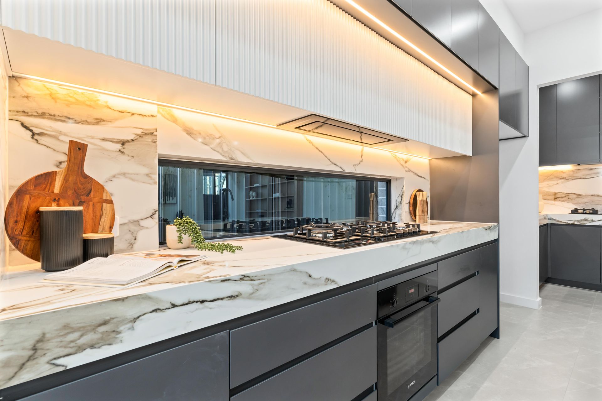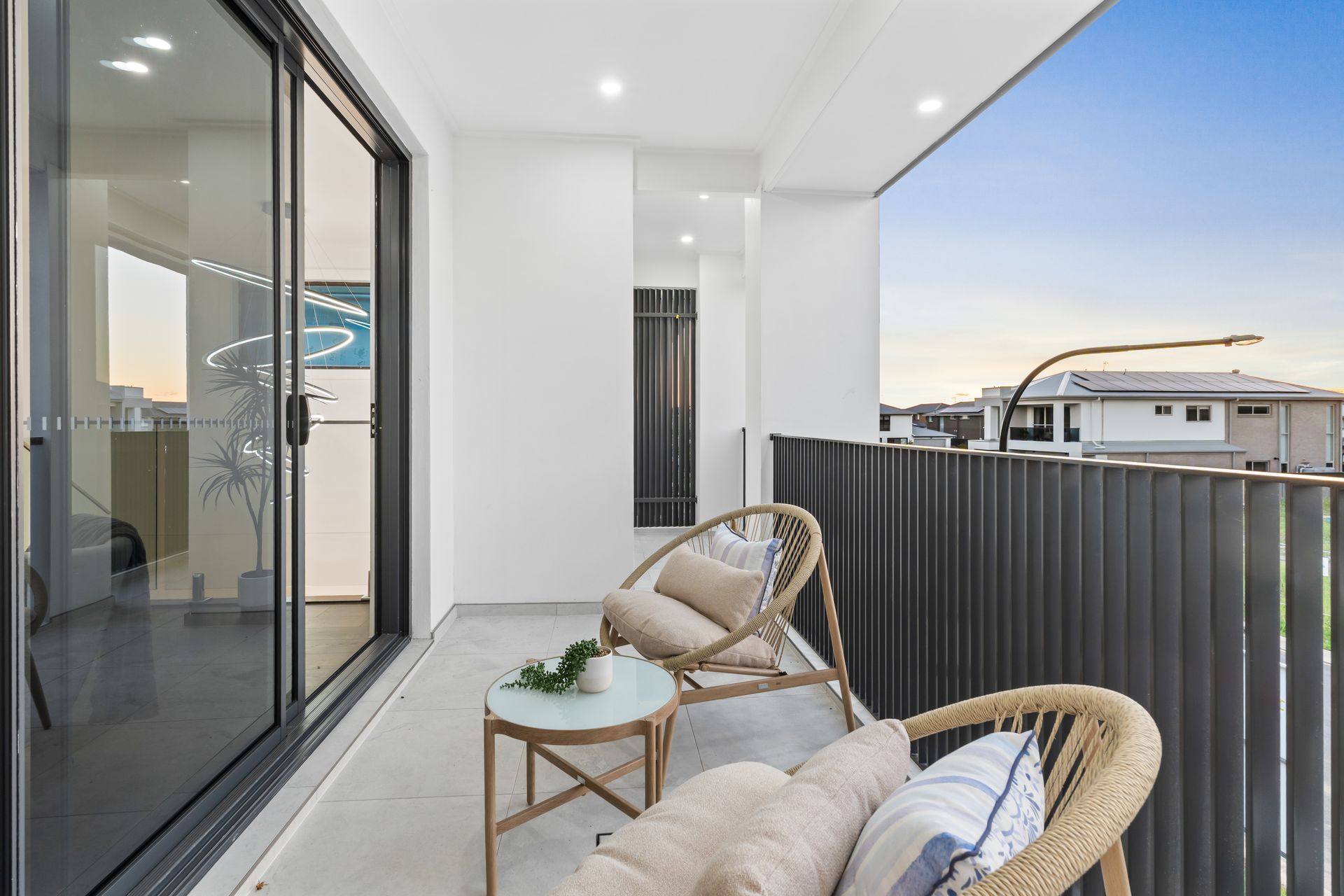 Then the photographer walked in. The same director who had placed every sofa, angled every cushion, and dressed every shelf now controlled the camera. In the kitchen, the shot pulled wide to capture the LED strip lighting under the fluted rangehood panel, the veined waterfall edge of the island, and the champagne and fruit board that made the space feel occupied. In the master bedroom, the lens framed the room so the dark headboard anchored the shot while the high strip window let in dusk light from the neighbouring roofline. On the upper balcony, the rattan chairs and striped cushions were positioned against the fading sky. Every photograph was composed for the angle the staging was built to serve. One director, one brief, one day — home staging Sydney delivered as a single system.