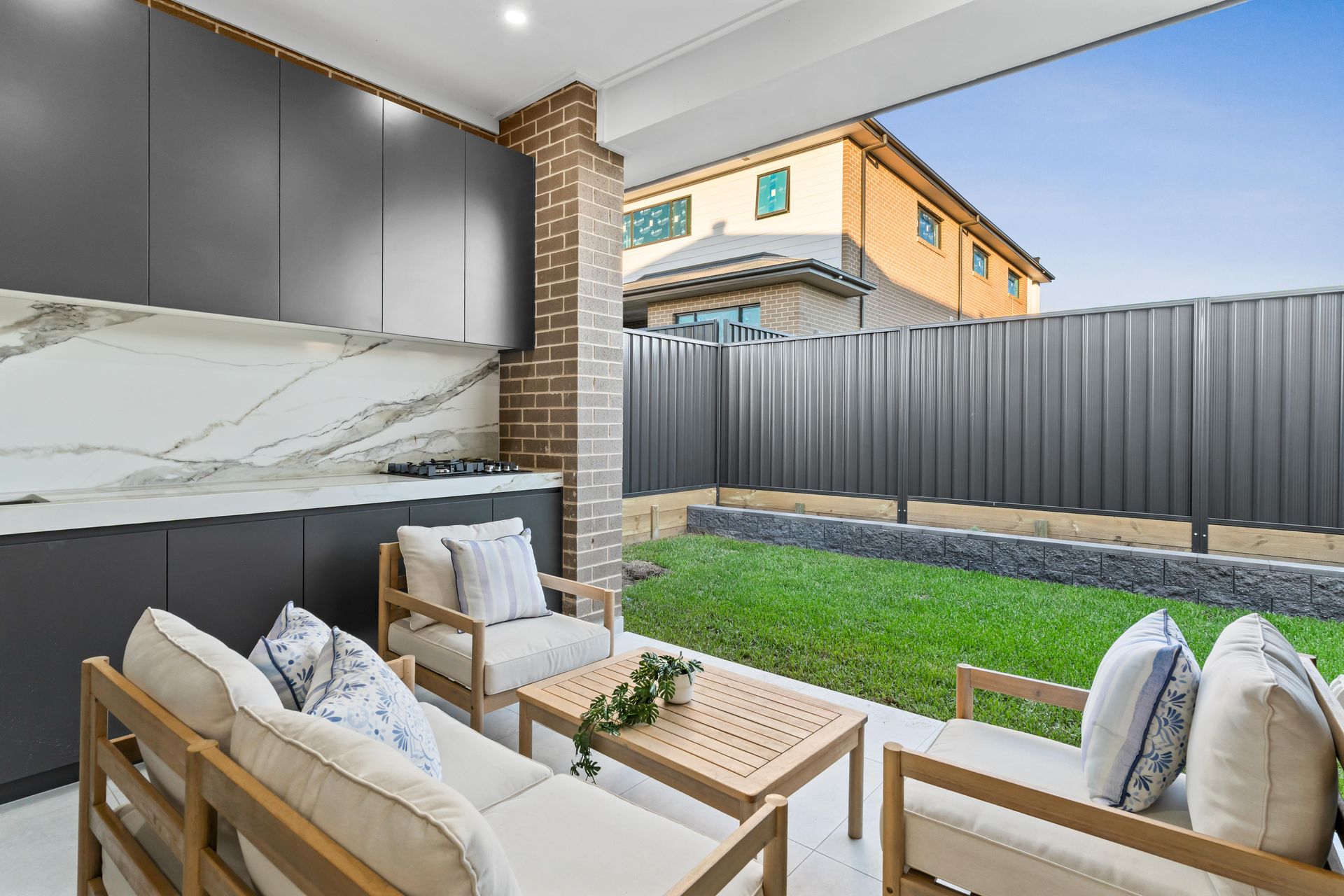 The alfresco area was staged as a fully functioning outdoor room. Timber-framed lounge furniture with linen cushions sat beneath the covered patio, facing the lawn. The outdoor kitchen — dark cabinetry with a marble splashback and gas cooktop — was dressed with small greenery and left deliberately pared back. The message was clear: this is where Saturday happens.