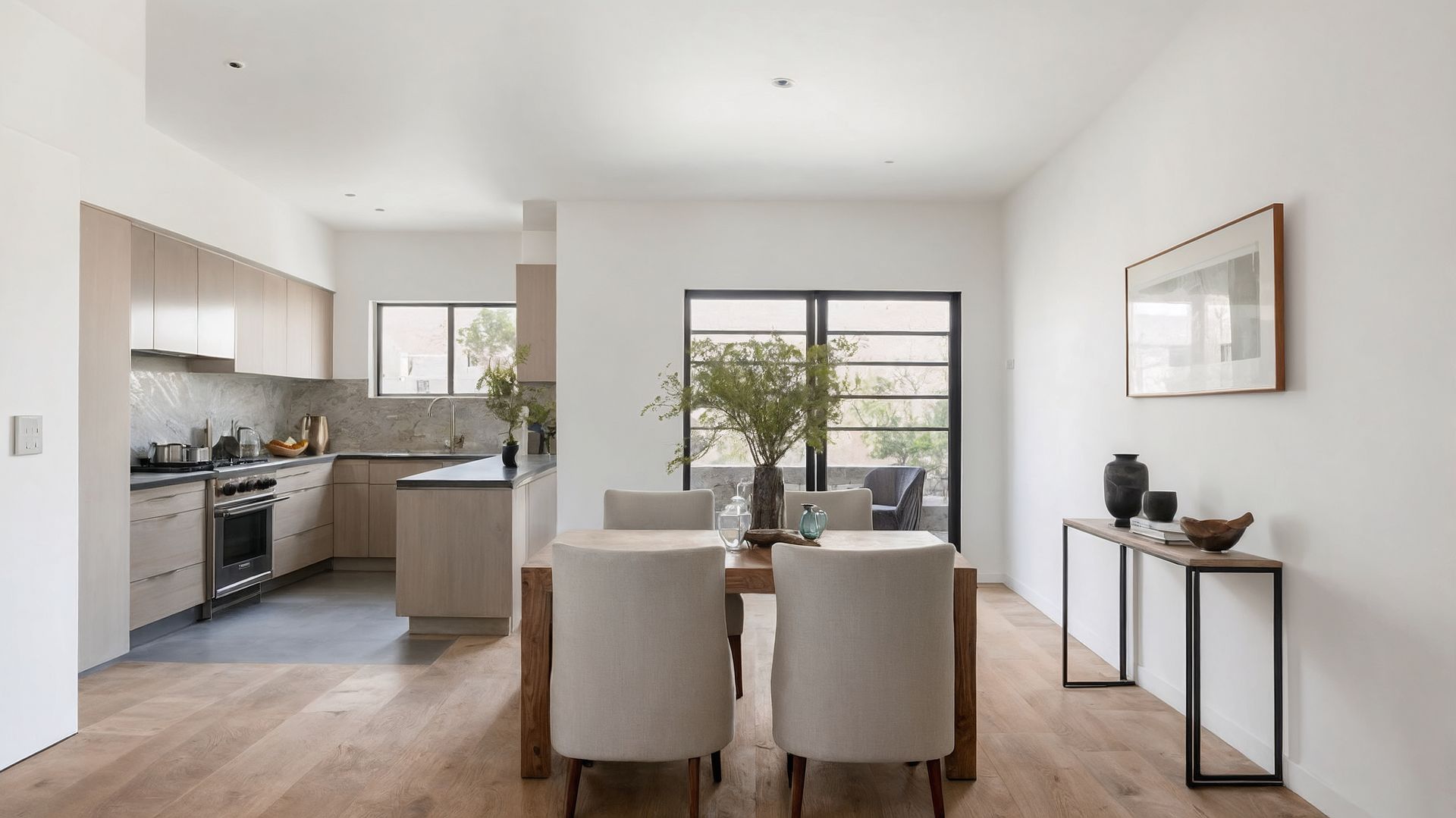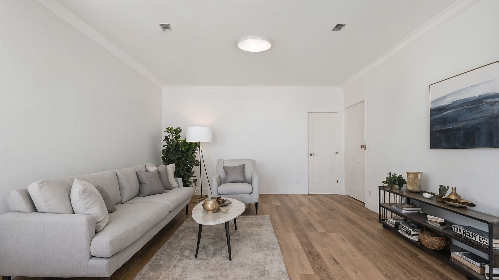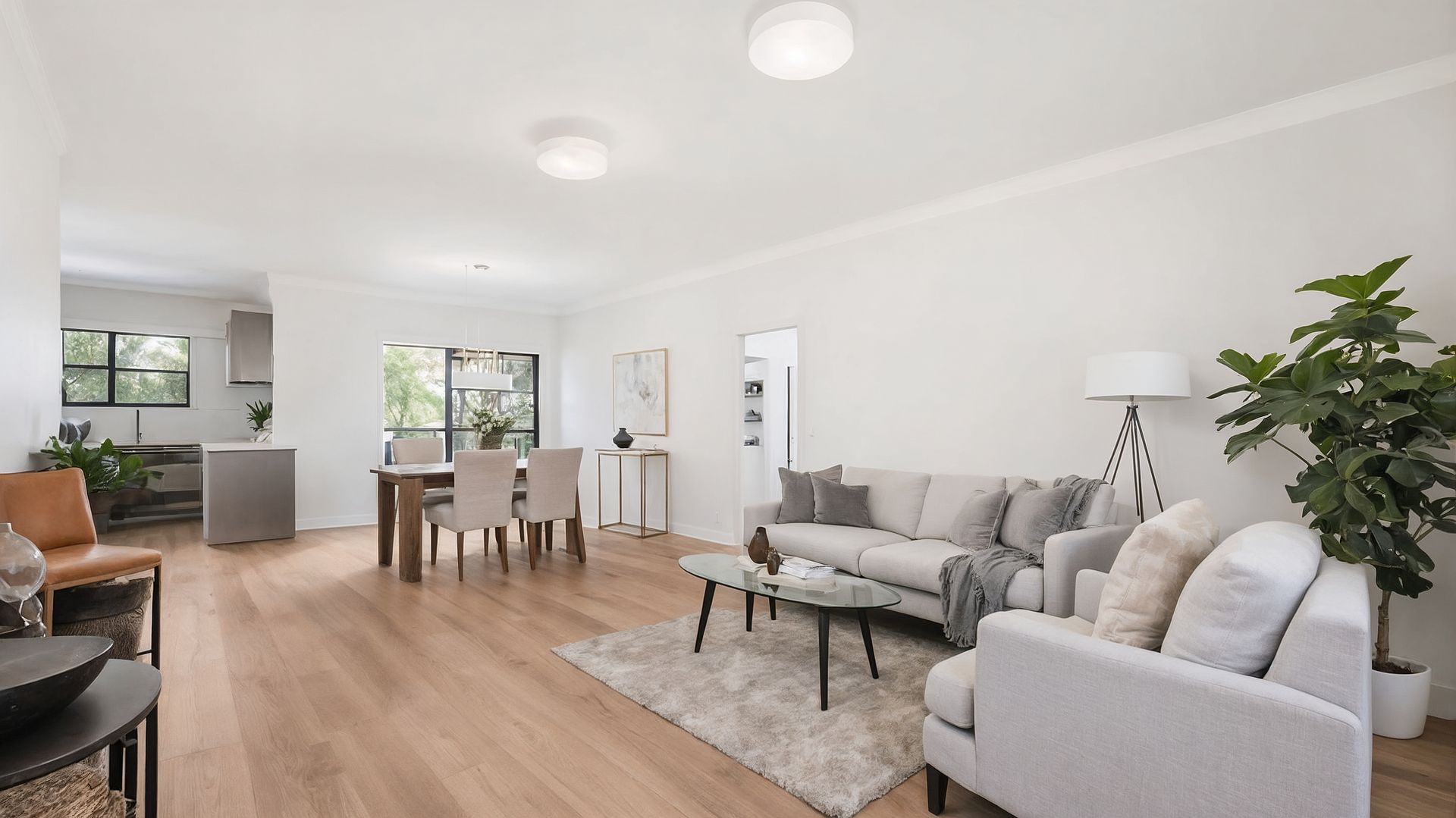 Staging day was Friday. In the main living area, a three-seater sofa in pale grey linen went against the longest wall, opening a sight line that ran unbroken from the front door through the dining zone and into the kitchen. A diamond-lattice rug in warm taupe anchored the seating zone without masking the timber floor — the floor was an asset, and the rug framed it instead of hiding it. A marble-top coffee table on black legs sat low enough to keep the eye moving. Green linen cushions and a full-height fiddle leaf fig solved the cold corner furthest from the windows — the dead zone where buyers' attention had been dropping off during inspections.