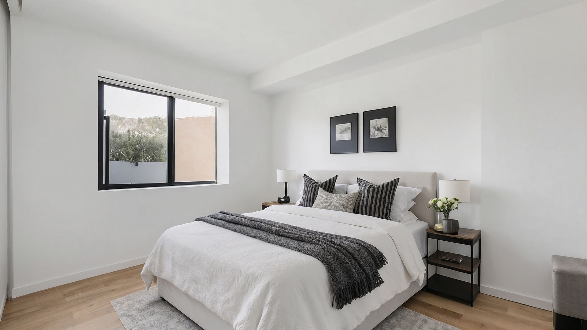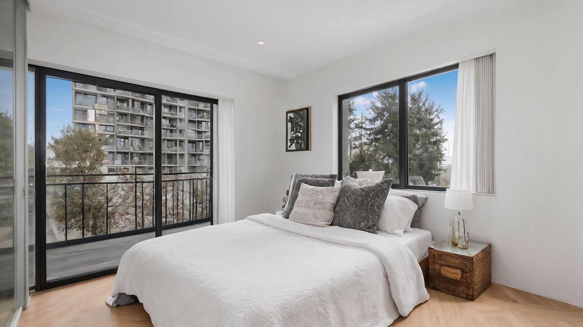 In the master bedroom, the mirrored wardrobe became a deliberate tool, not just storage. A queen bed with white bobble-texture coverlet and black-and-white botanical cushions was positioned to catch the balcony light from the sliding door and the morning sun from the east-facing window simultaneously. One abstract line drawing above the headboard. Oak-toned bedside tables with matching white lamps. The mirror doubled the depth of the room and reflected the balcony greenery back into the frame. A buyer walking in saw a bedroom twice the size of reality — and it felt honest, because everything the mirror showed was actually there.