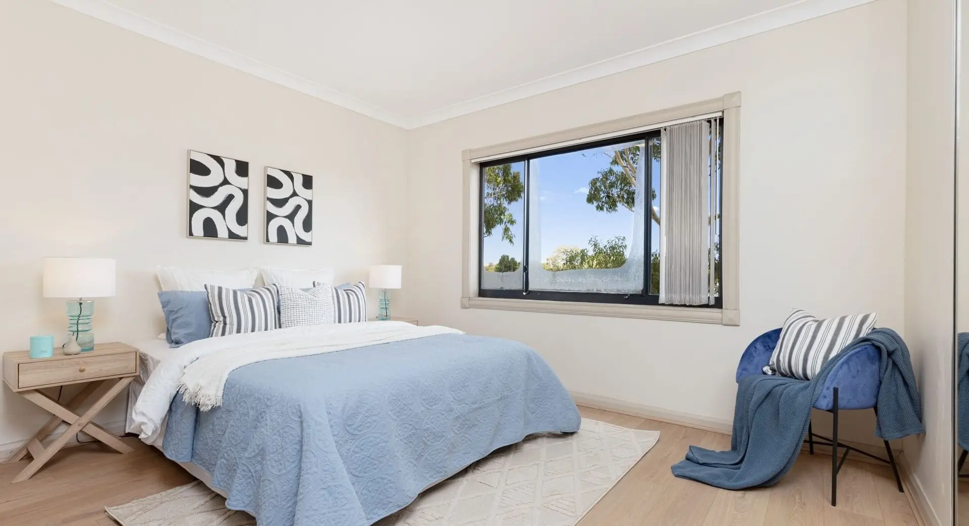 The bedrooms were finished in soft blues and layered linen textures—fresh, youthful, and universally appealing. This was strategic: buyers respond emotionally to bedrooms more than any other room, and blue is one of the most trusted colours in real estate psychology. We wanted comfort. We wanted calm. We wanted the “I could sleep here tonight” effect.