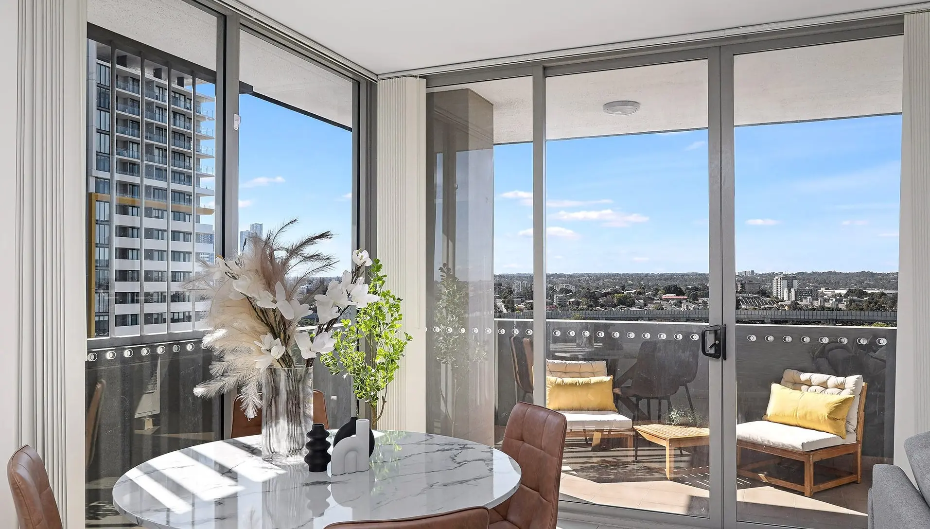 On the balcony, a touch of timber, soft cushions, and greenery reframed the view — from “another high-rise outlook” into a morning coffee retreat.
