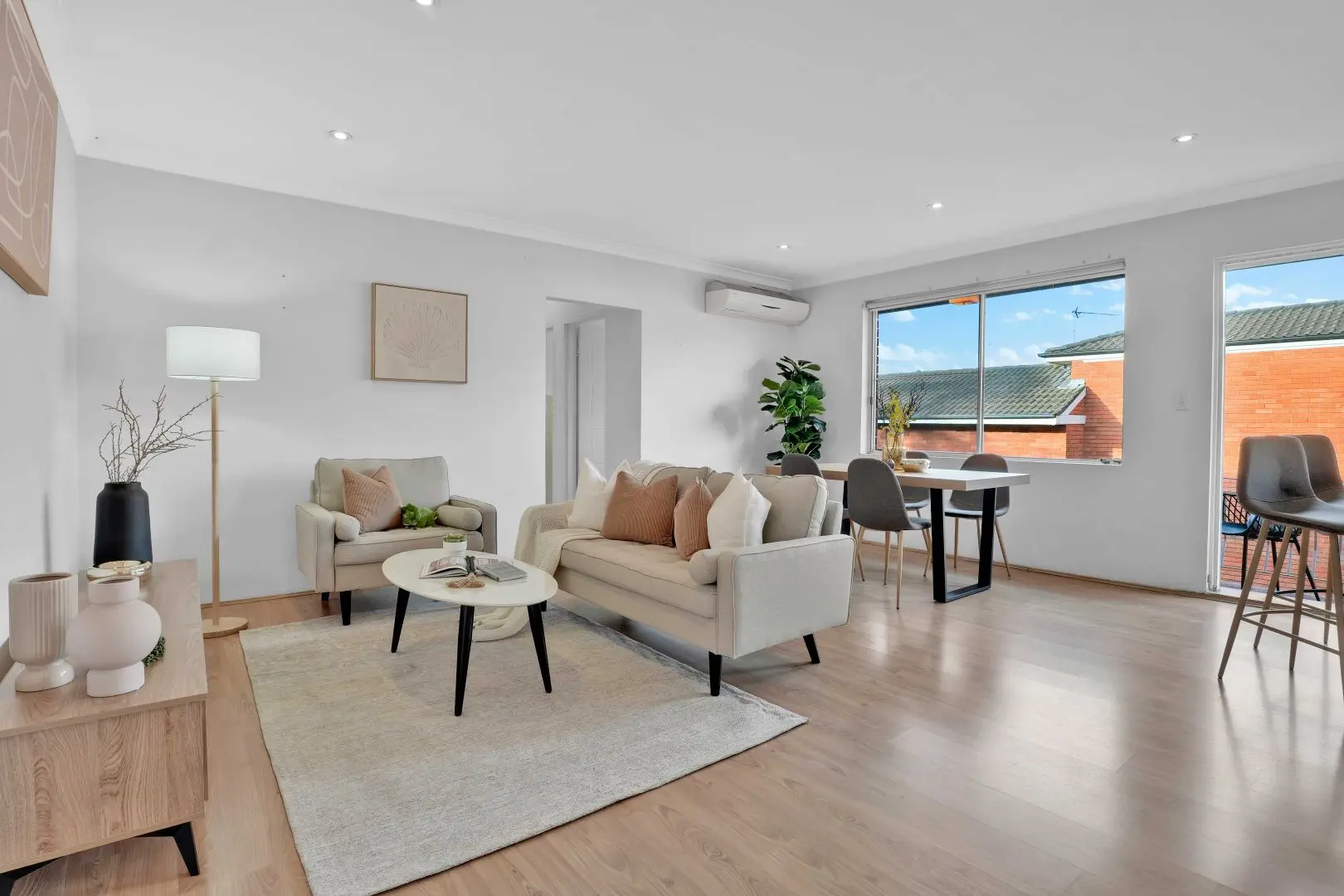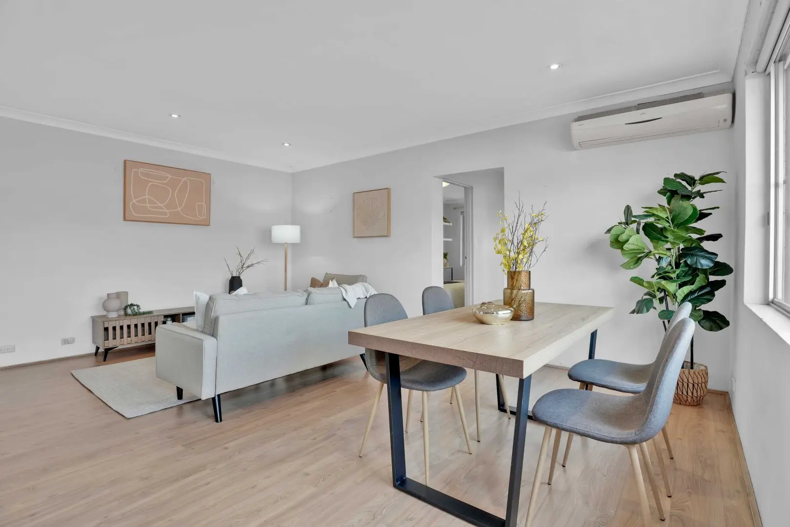 At the dining end, right by the big window, we set a natural oak table on black steel legs with four grey upholstered chairs—comfortable, narrow footprints, perfect for open-plan sightlines. A fiddle-leaf fig and a bud-vase arrangement gave life to the wall under the split-system A/C (visible, yes; softened, absolutely). Now the long room read like three scenes—lounge → meals → balcony—instead of one echoing tunnel.
