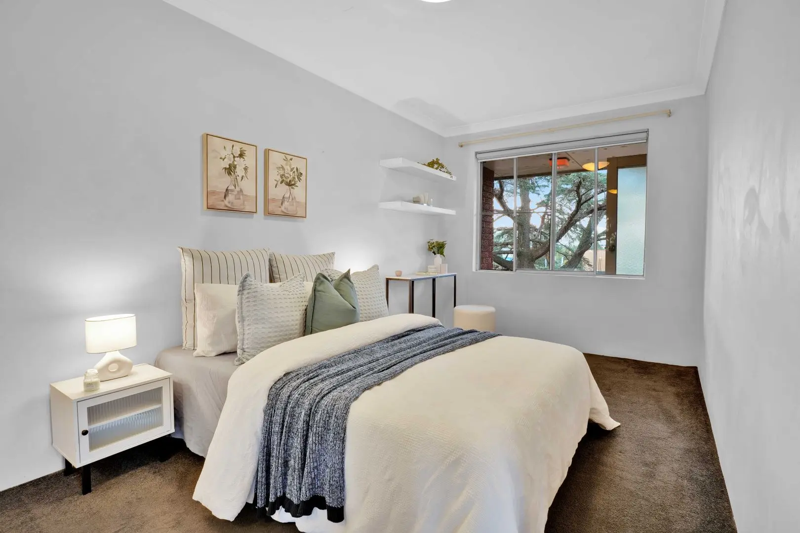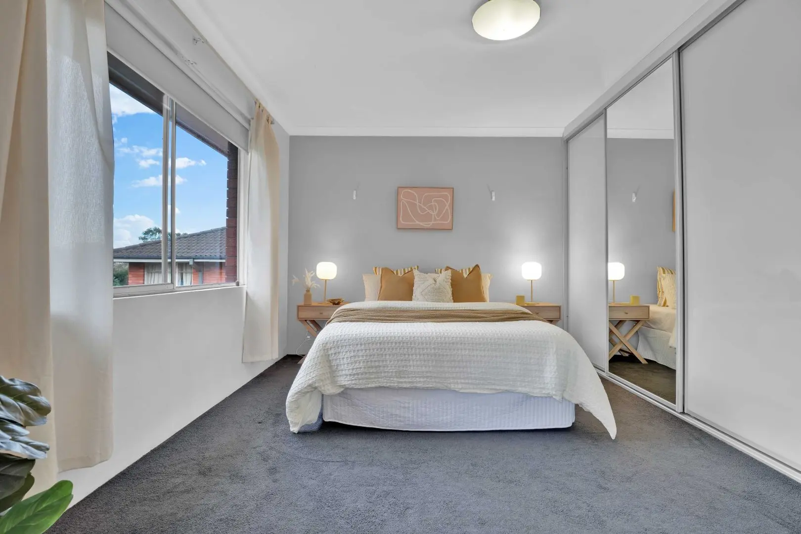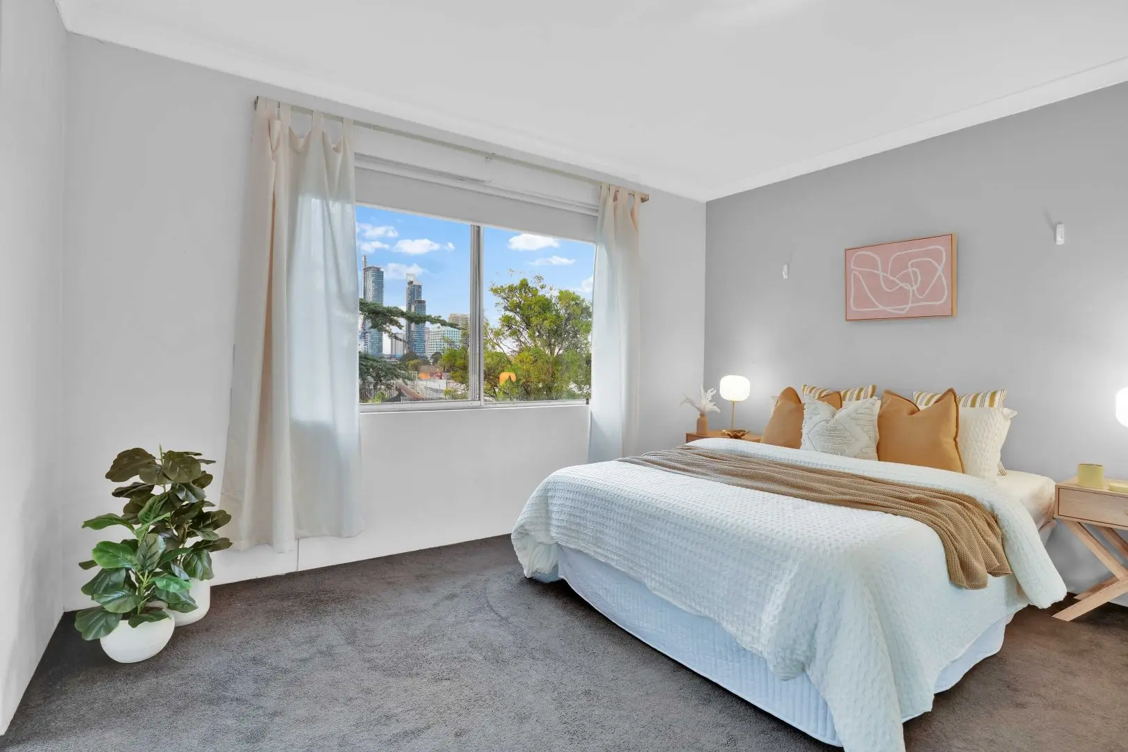 Bedrooms = trust. In the main bedroom, we leaned into calm: a gentle grey feature wall, warm mustard and cream cushions, and timber X-base bedsides with round white lamps. The mirrored robe doors did what mirrored robe doors should—double the light—so we kept everything tonal and layered, not shiny. The second bedroom was the “surprise and delight” zone: layered bedding, a soft navy throw, botanical prints and wall shelves with small curated pieces. From one window you catch a glimpse of the Chatswood skyline; we made that a feature, not a footnote, by keeping the curtains light and the sightline clear.