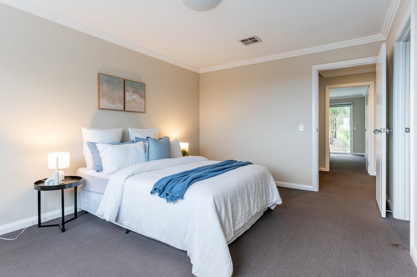The granny flat received the opposite treatment. Cool navy and coastal tones — a linen sofa with deep blue cushions, black metal nesting tables, a textured wave-pattern rug on the floor. The bedroom ran white bedding with a teal throw and a pair of coastal diptych prints above the headframe. Black round side tables with white ceramic lamps framed the bed. Where the main residence said family warmth, the granny flat said independent retreat. A buyer walking from one space into the other would feel the shift before they could name it. That was the point.