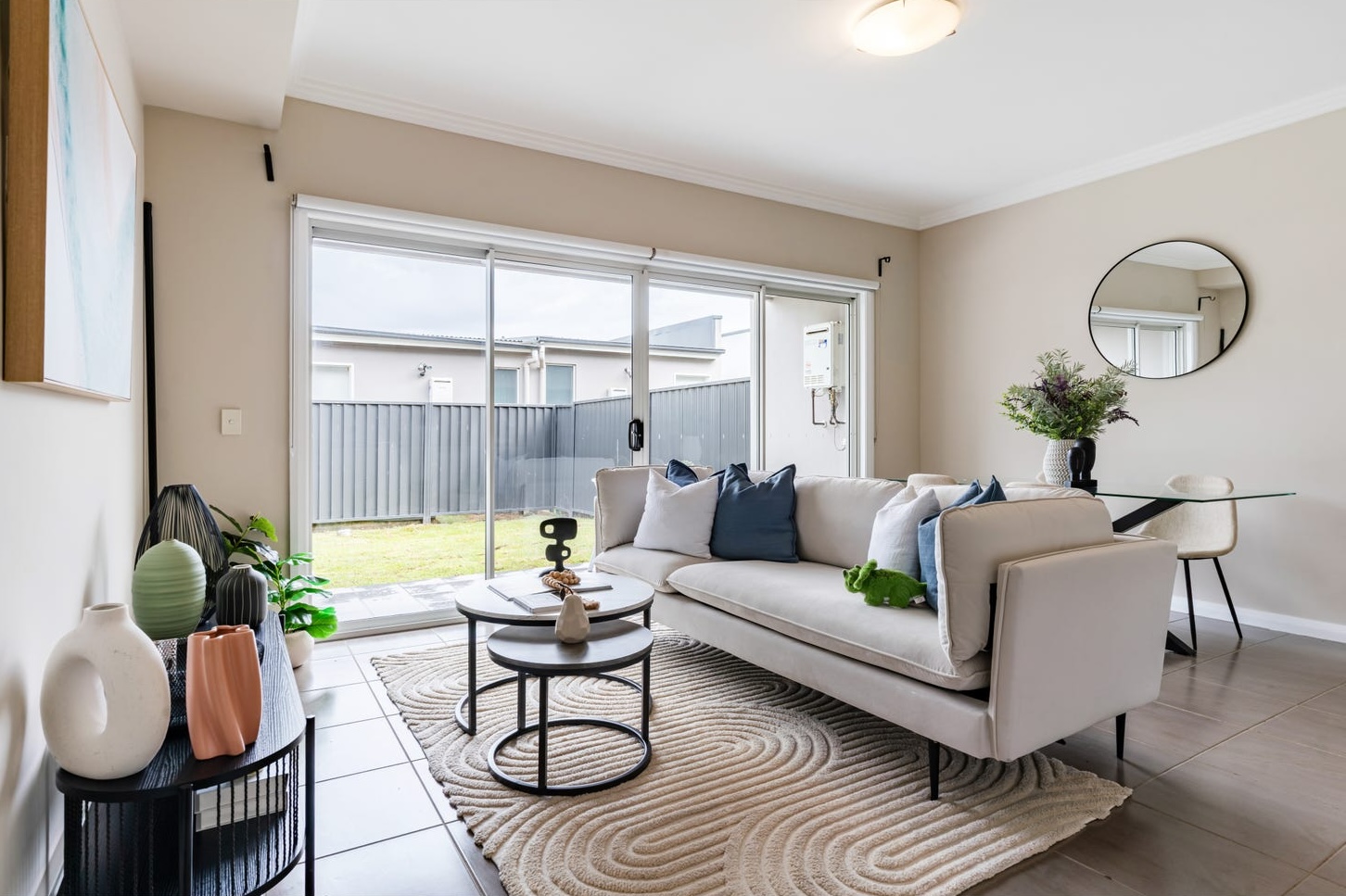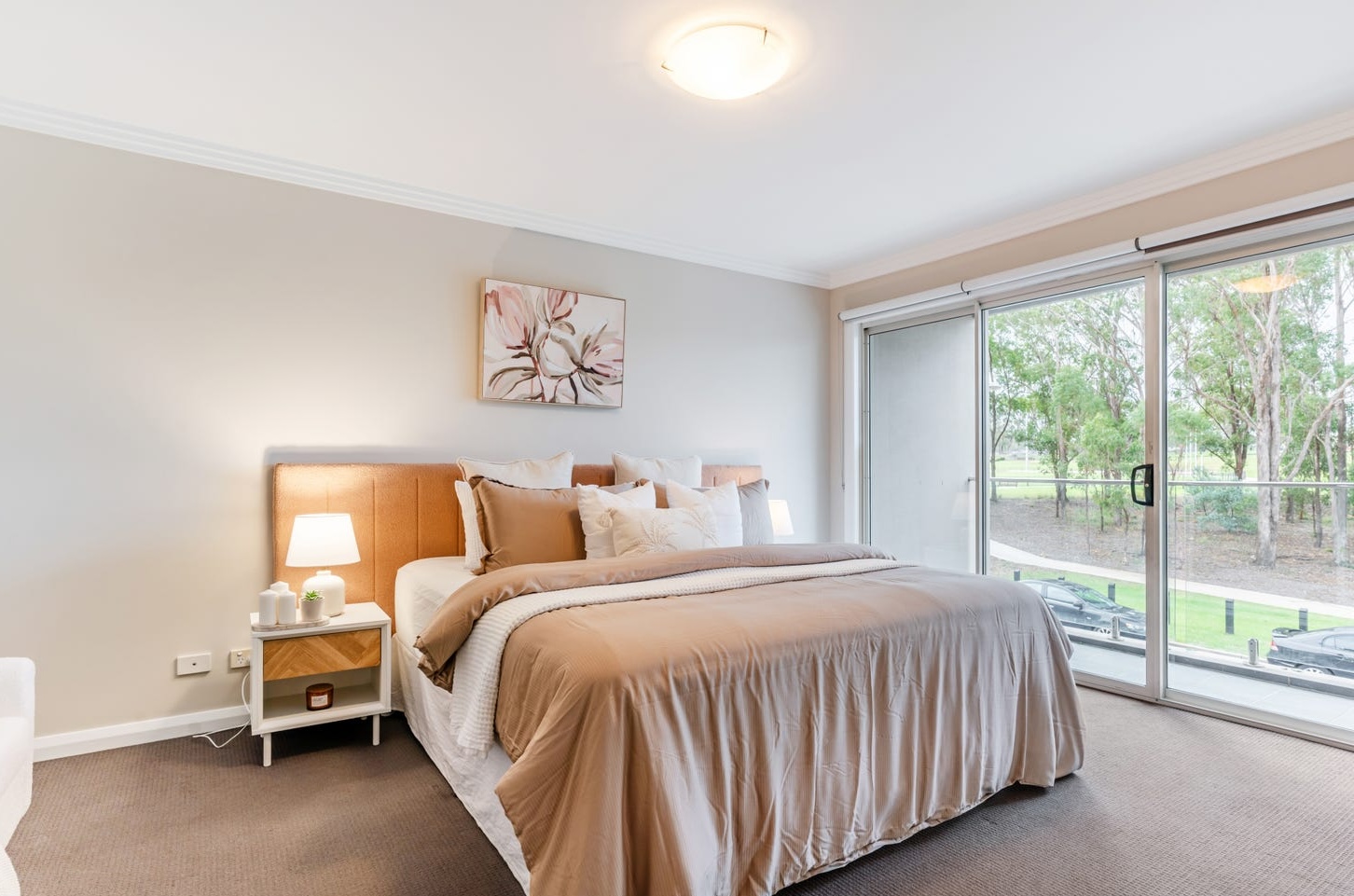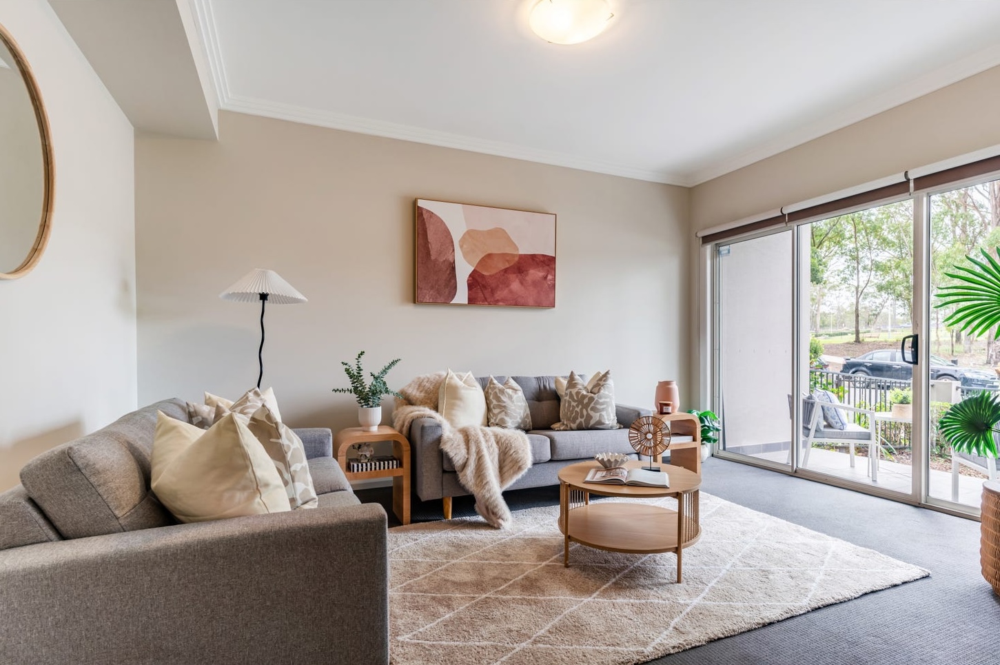 The staging solution was a deliberate two-palette split. The main residence was built on warm tones — a grey L-shaped sofa dressed with blush and cream cushions, a tan leather headboard in the master bedroom, abstract artwork in rose and peach above the living area, a faux fur throw draped across the arm of the lounge. Oak nesting coffee tables anchored the room. A gold-framed mirror on the entry wall expanded the sight line from the front door through to the sliding doors and the parkland beyond. In the master bedroom, a herringbone-patterned bedside table and ceramic accessories kept the warmth layered without tipping into clutter.
