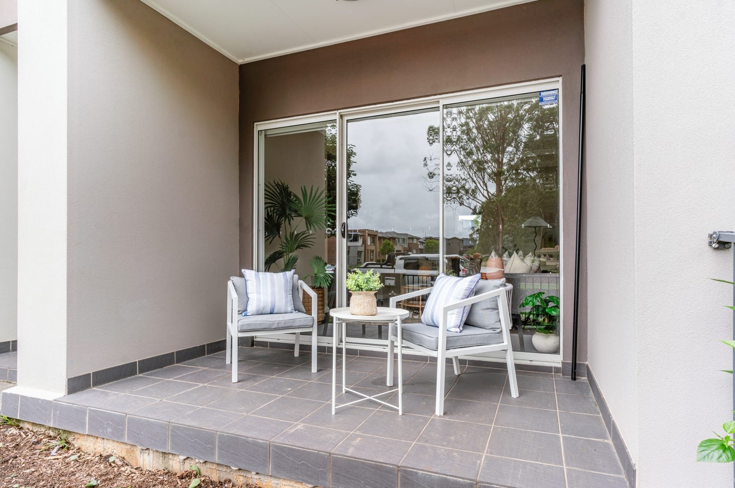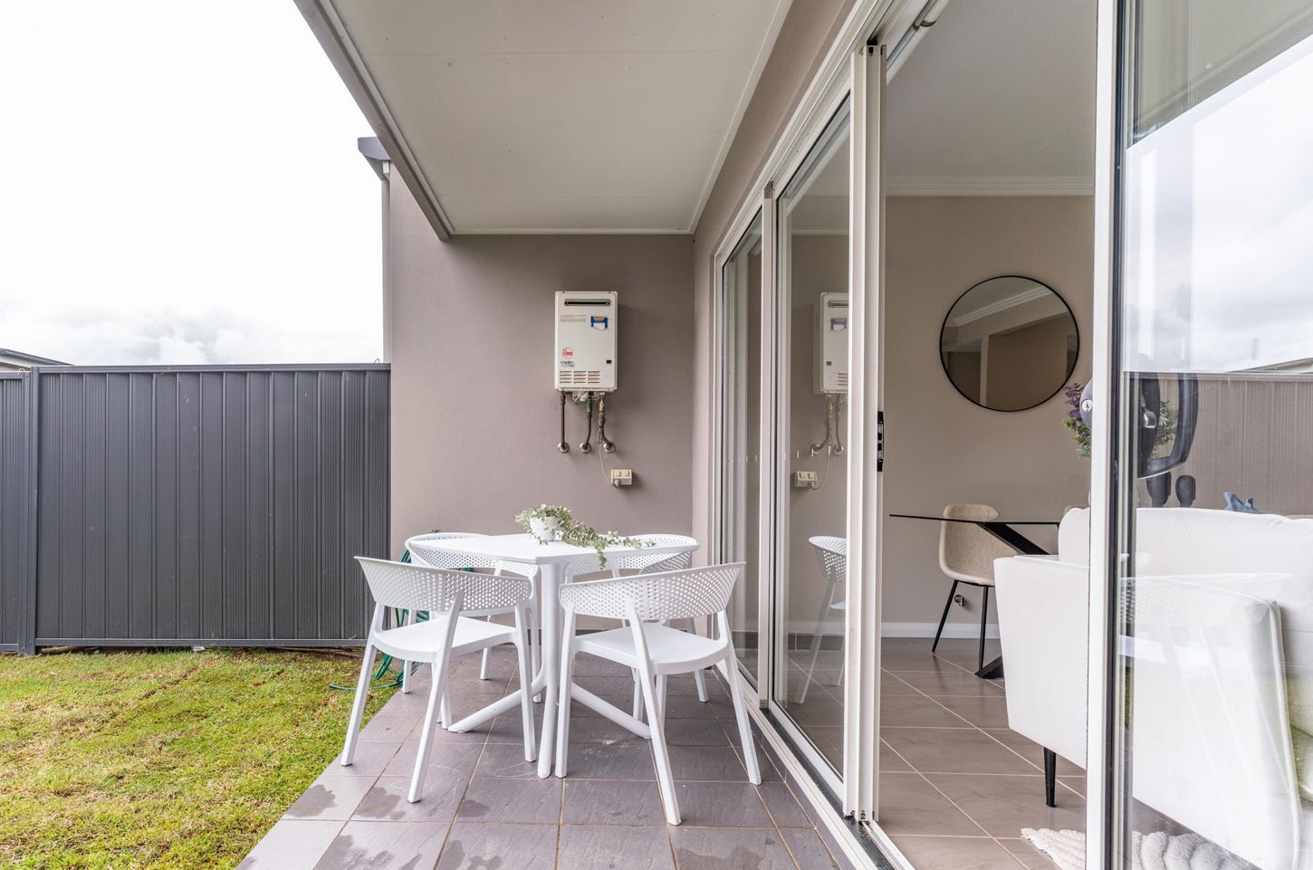 Outside, the front patio received a pair of white outdoor chairs with blue-striped cushions — a nod to the granny flat palette, signalling to buyers arriving at the private entrance that this was its own space. The rear courtyard got a white four-seat dining setting with trailing eucalyptus on the tabletop and fresh turf laid across the yard. Every outdoor zone mirrored the interior it connected to.