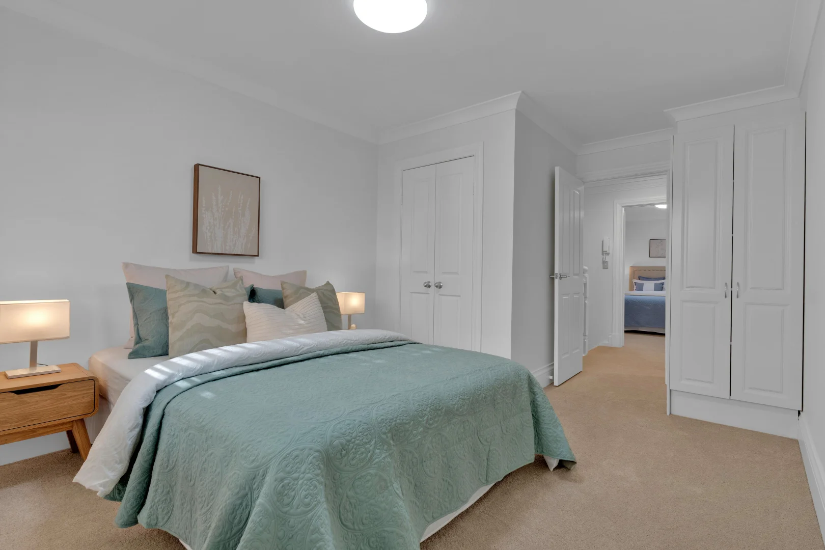 The second bedroom followed a soft eucalyptus palette with light oak side tables—fresh, calm, and photogenic. The beds looked hotel-perfect, but not staged-perfect. A buyer could imagine real mornings there.