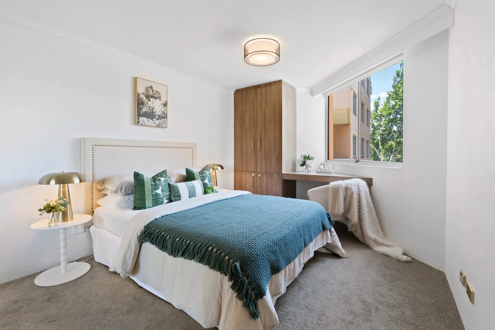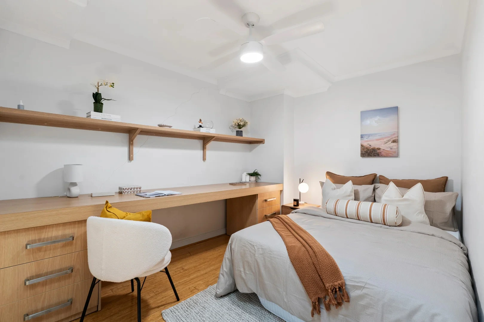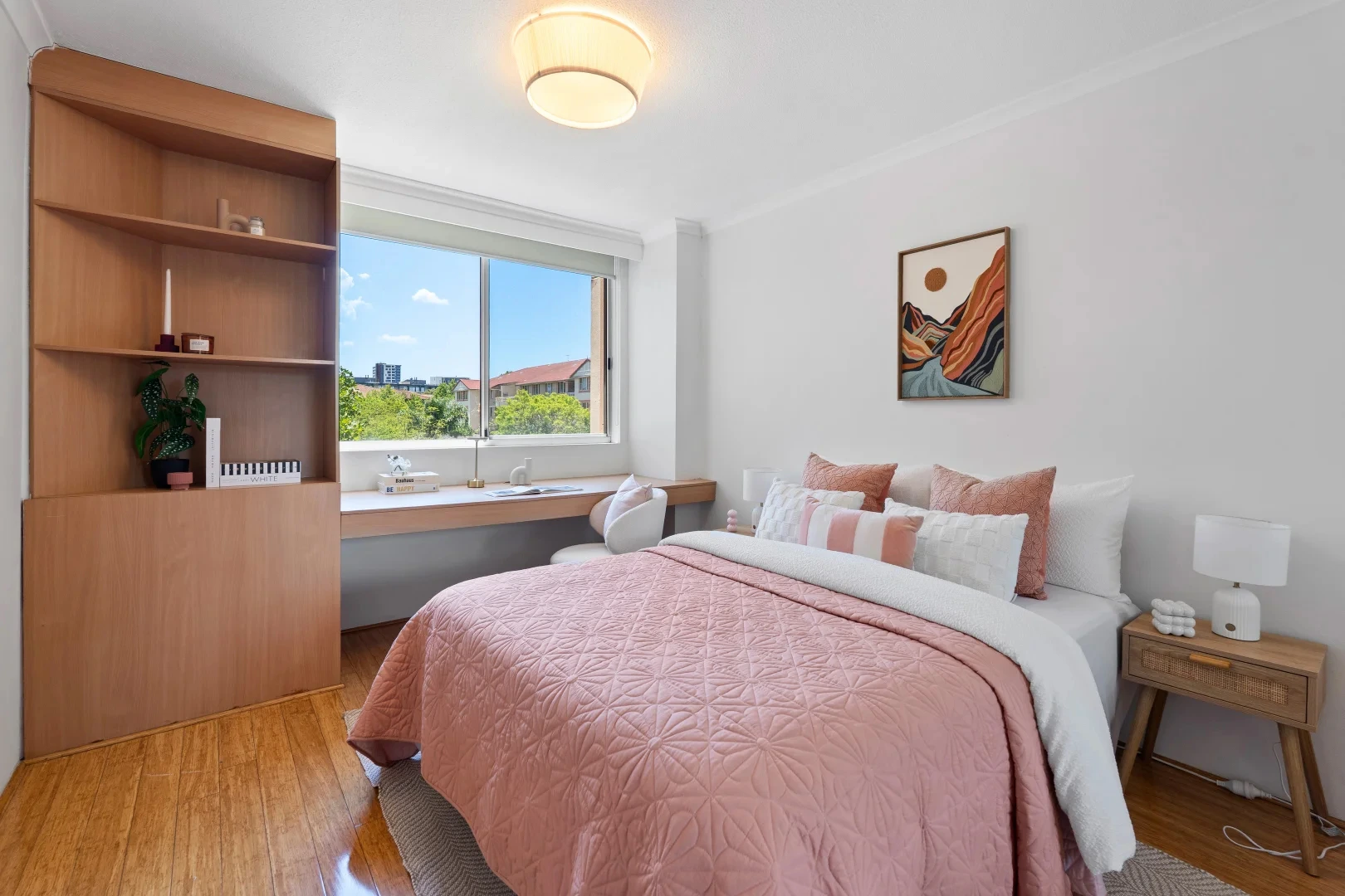 The bedrooms were treated like a decision-maker’s shortcut: calm, tidy, emotionally obvious. One room leaned into crisp whites and layered greens — a clean, boutique-hotel vibe with warmth. Another introduced soft blush tones paired with timber and simple artwork — creating a gentle, contemporary feel that photographs beautifully and widens buyer appeal (it’s not “girly,” it’s soft luxury). And the study/desk zones were styled with restraint: enough to show function, not enough to feel like someone else’s life. Buyers want to imagine their laptop there — not yours.