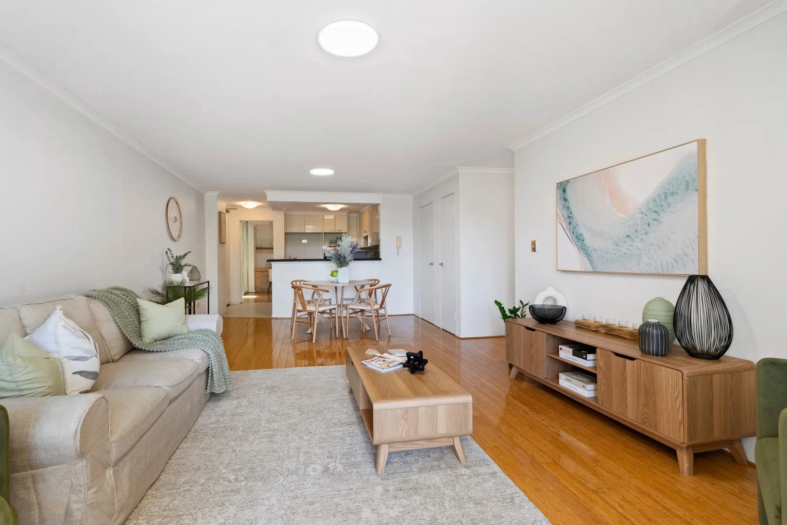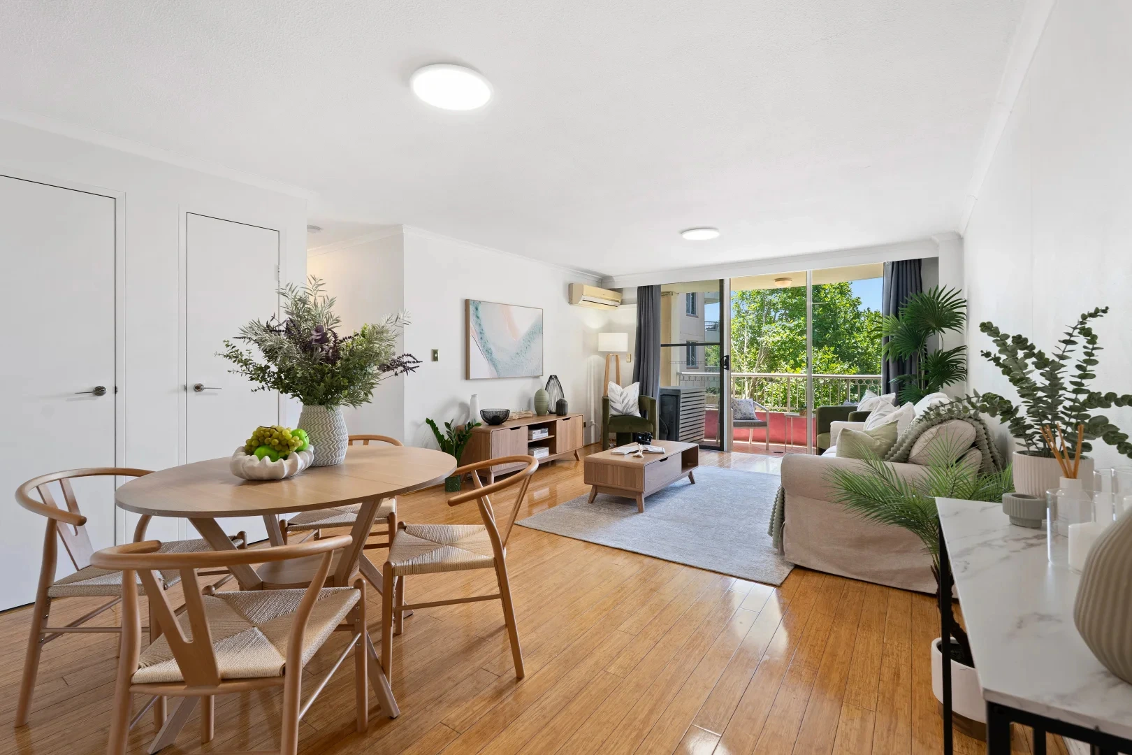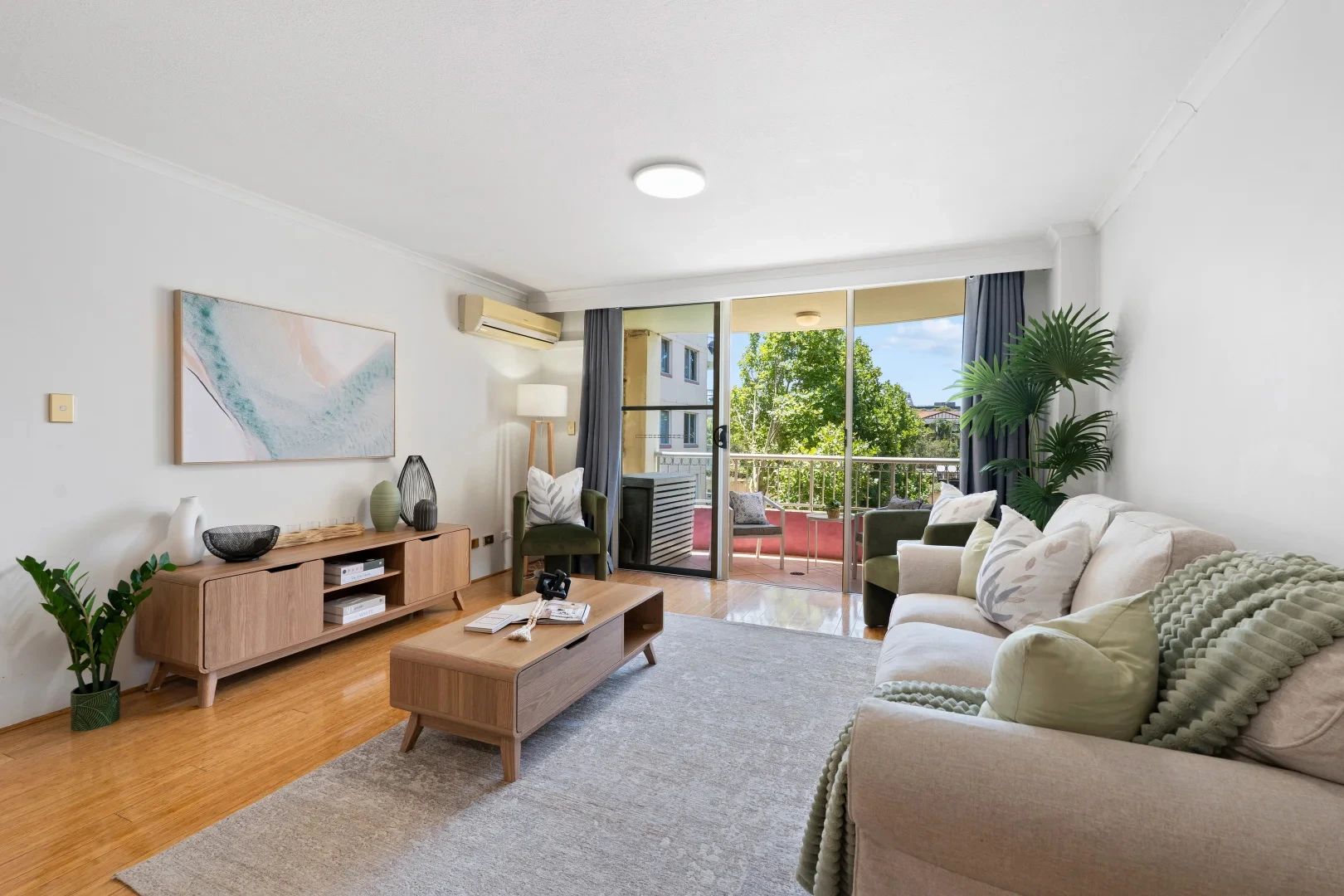 A light-filled Sydney apartment with warm timber floors, a balcony breeze, and a styling plan built to sell — not just to look pretty
