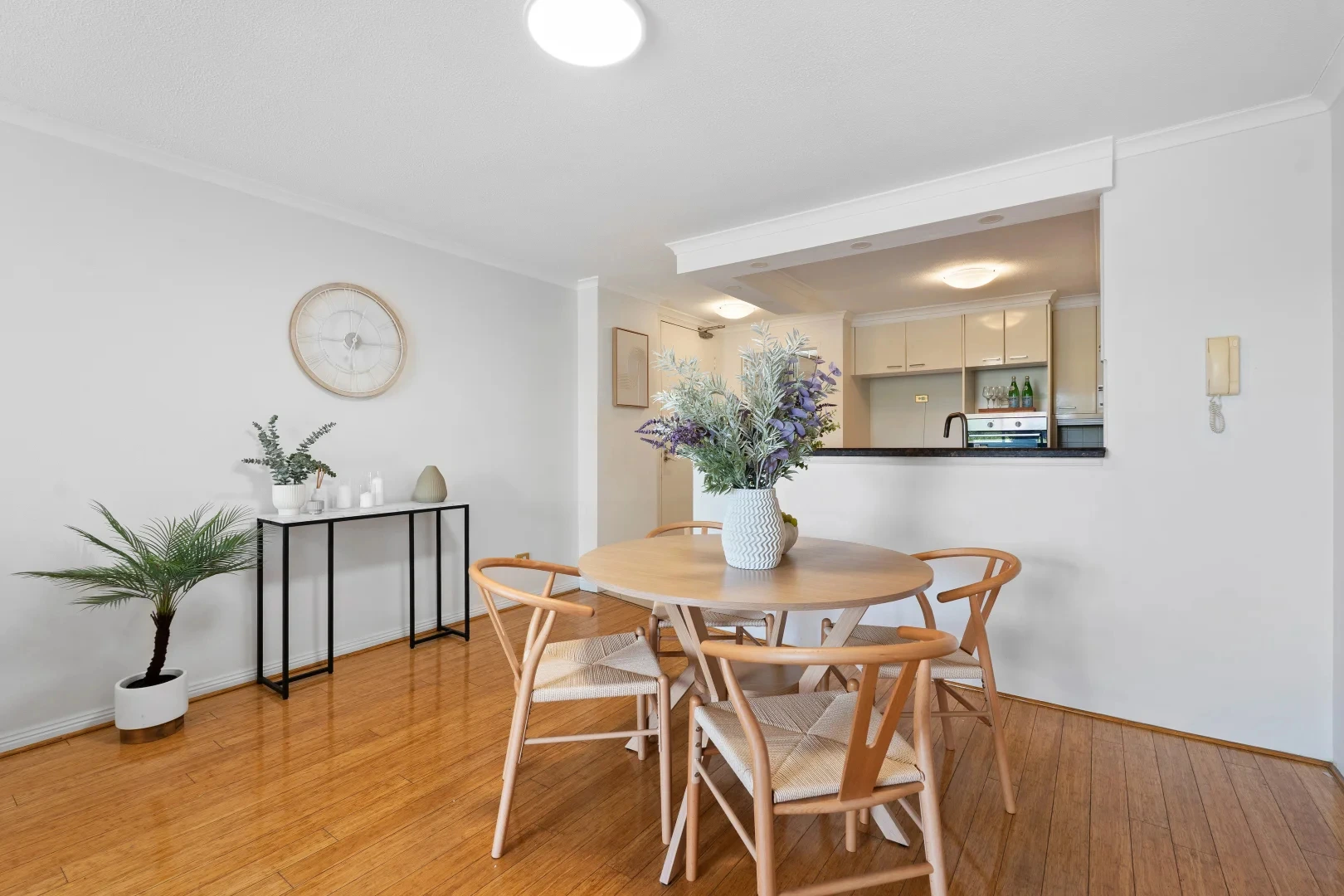 In the dining space, we went round — literally. A round table softens the whole open-plan area and makes movement feel easy, especially in apartments where every walkway counts. Light timber chairs kept it airy. We used a simple centrepiece that reads fresh and premium without screaming “I staged this 15 minutes ago.”