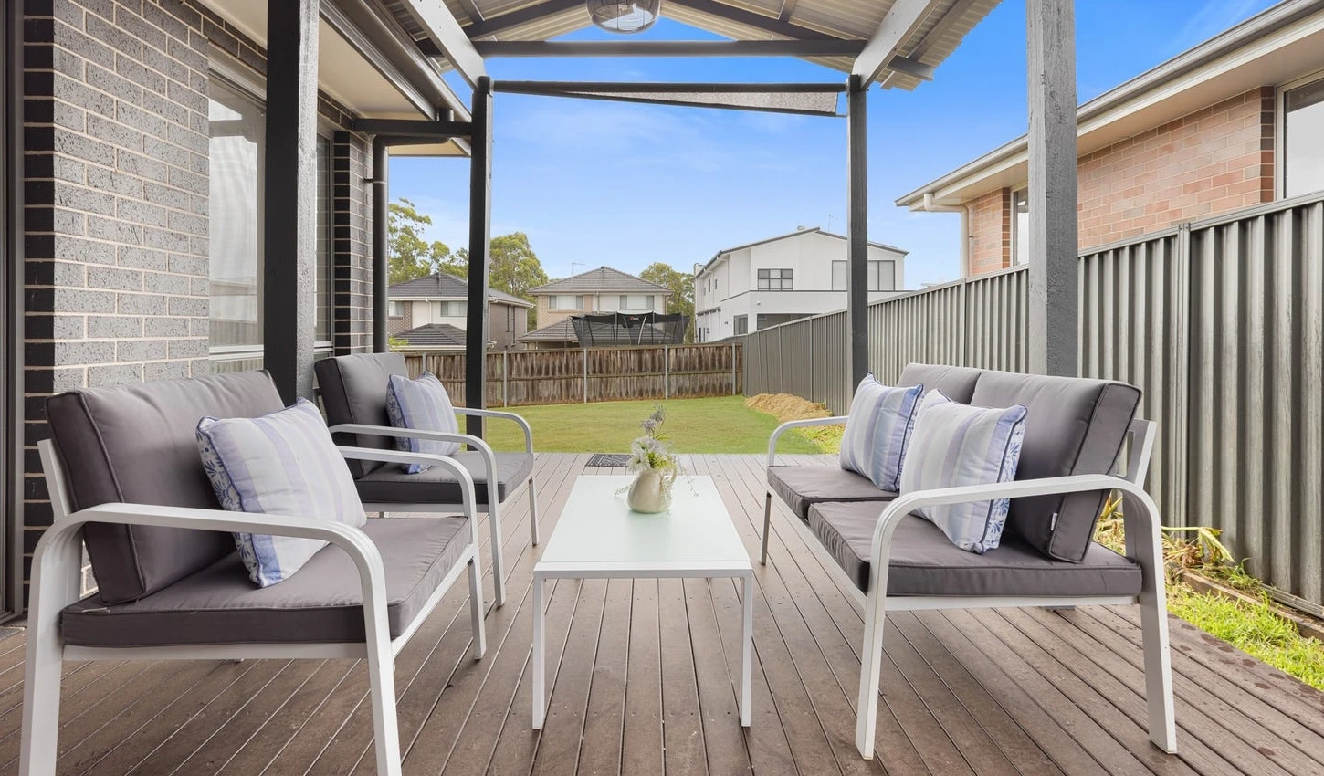 Instead of treating it as “extra,” we styled it as a second living room. Symmetrical outdoor seating, soft cushions, clear table — suddenly the backyard felt like a lifestyle feature, not just grass behind a fence.