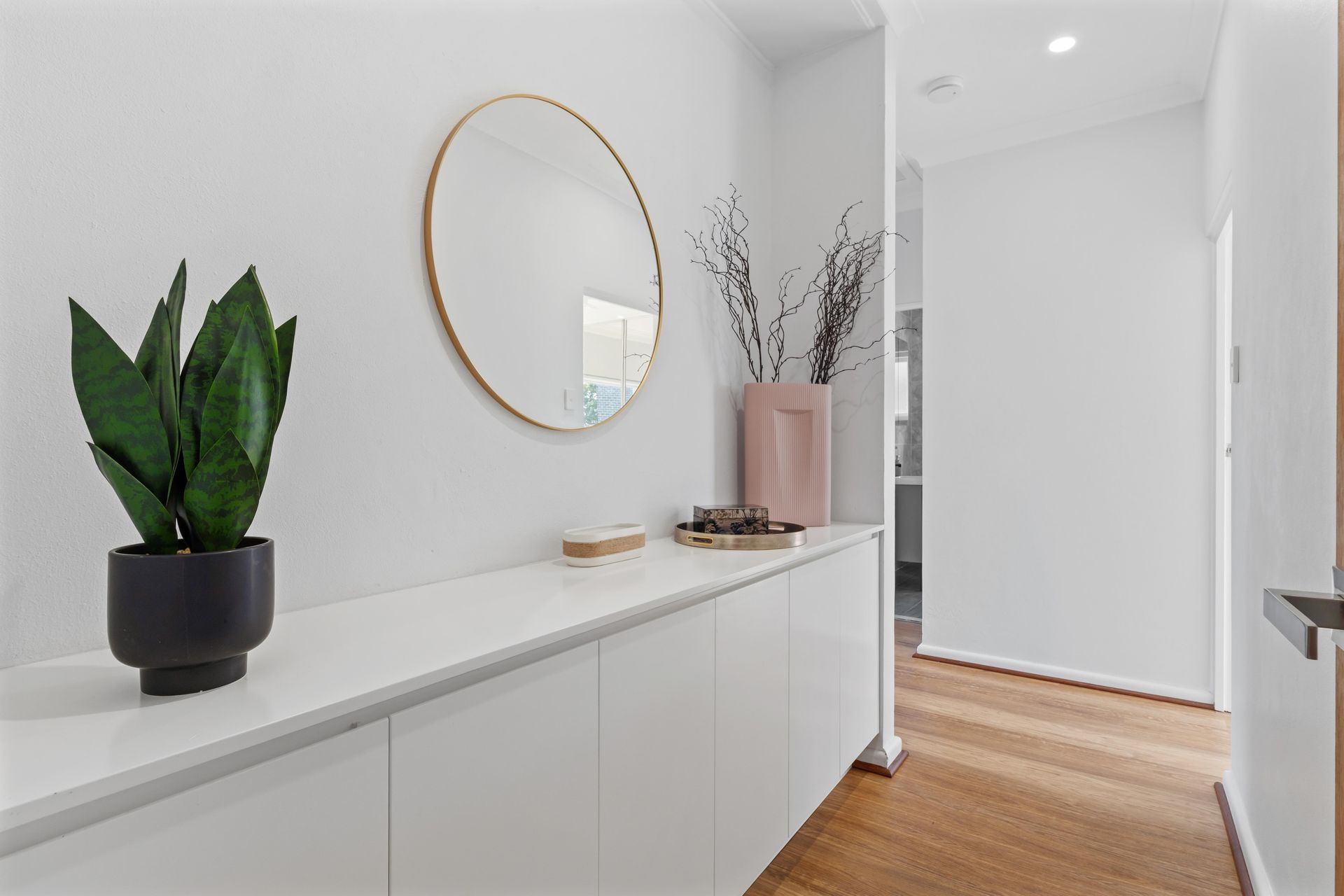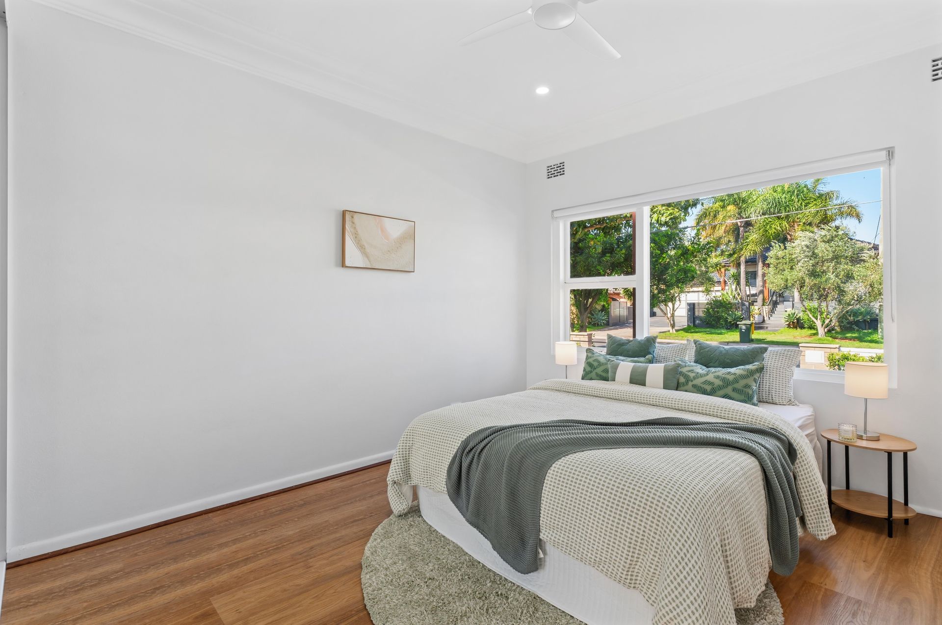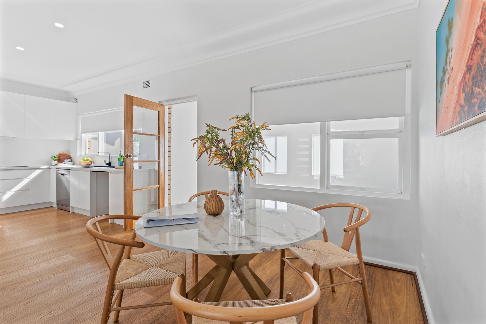 The dining room had the same problem magnified. White walls, timber floor, two windows with roller blinds. Without furniture, buyers would have guessed it was a hallway or an oversized landing. The director chose a round marble-top table on a timber cross-base with four wishbone chairs — the curved lines broke the room's rectangular shape and pulled the space inward. A tall native foliage arrangement in a clear vase added height and warmth. On the wall, a landscape artwork in warm outback tones became the only colour accent in the room — deliberate, controlled, enough to make a buyer pause at the doorway instead of walking straight past.