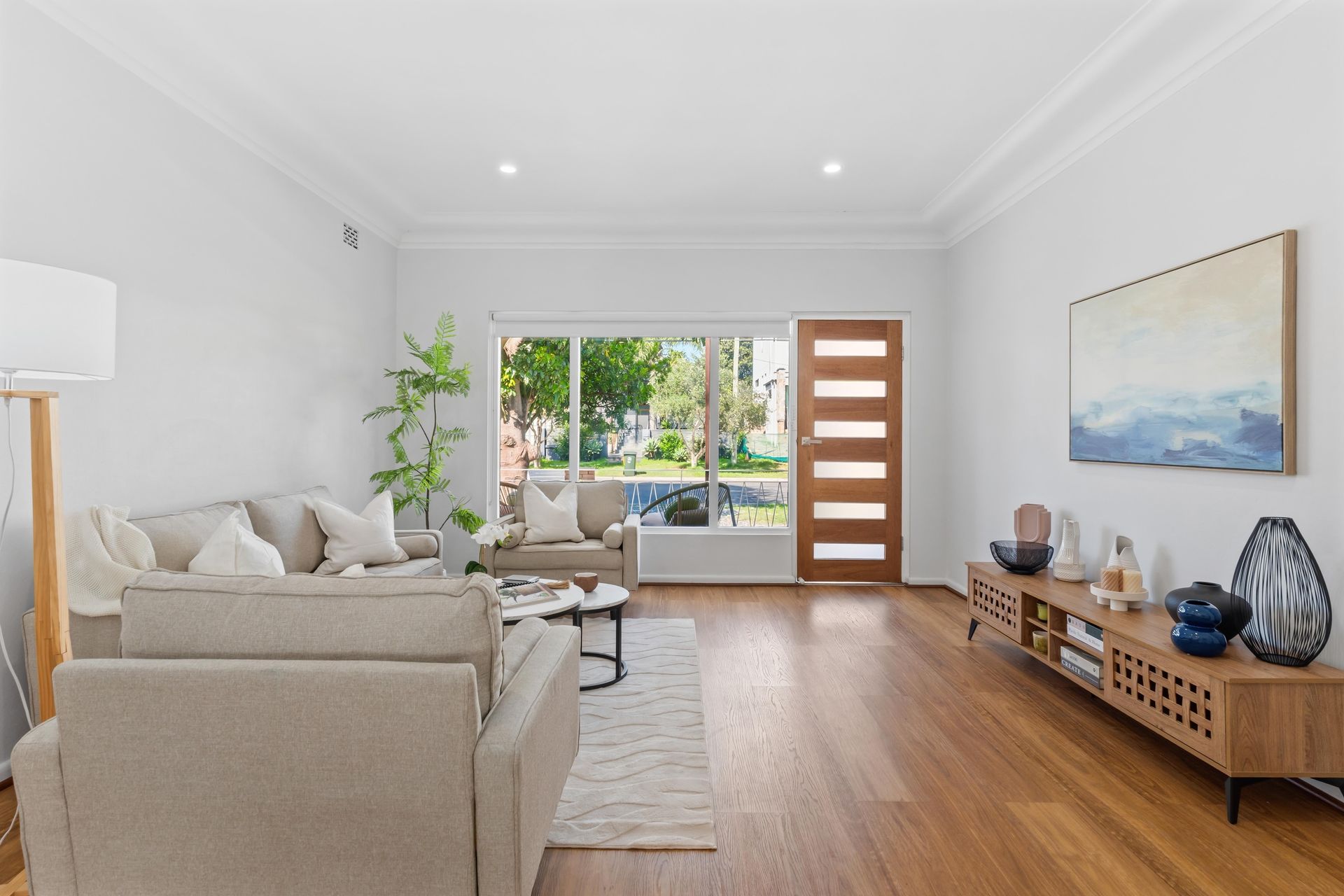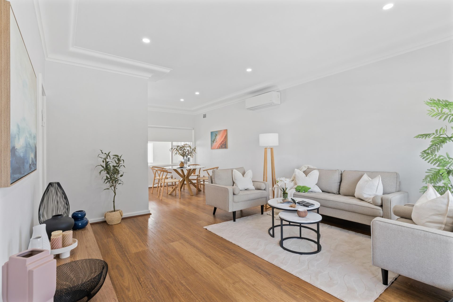 By midday the home staging Sydney team had transformed the property. The living room — a generous open-plan space with a wide front window — had been reading as a corridor. No anchor, no focal point, just timber floors running wall to wall. Goldpac placed a low-profile three-piece suite in warm linen tones — a sofa flanked by two armchairs — all on tapered legs that kept the floor line visible and the room feeling open. A pair of round nesting coffee tables in black metal and marble gave the centre a quiet weight without shrinking the space. A white textured rug defined the seating zone and stopped the eye from sliding straight through to the front door. A timber tripod lamp in the corner softened the overhead downlights. Three plants — a fiddle leaf, a trailing fern, and a cluster of greenery on the coffee table — brought life without clutter.