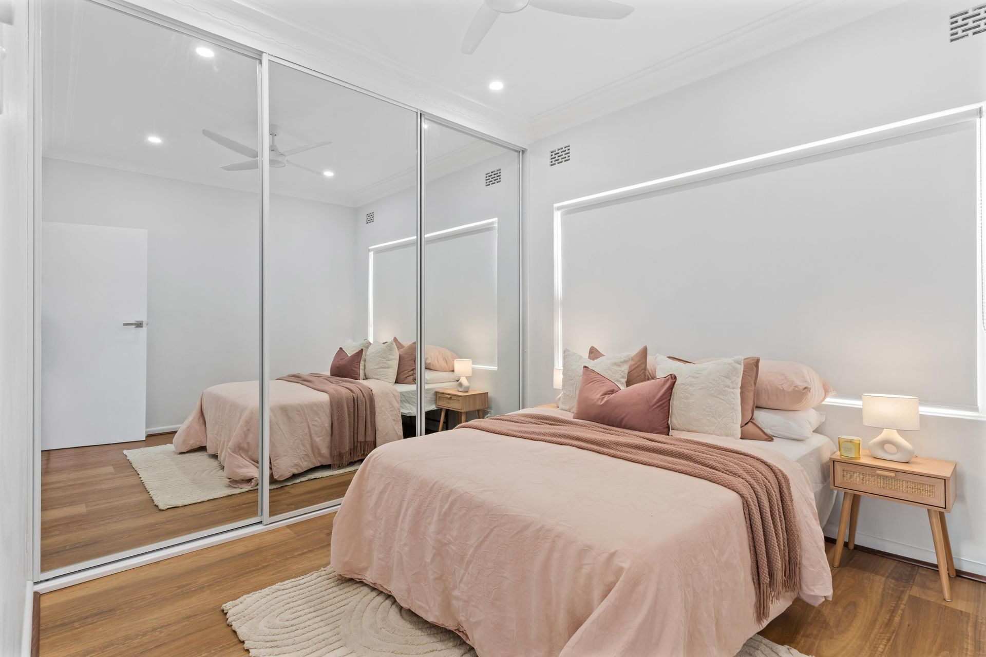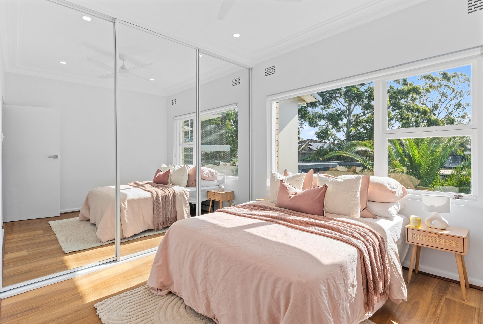 The master bedroom got the full treatment. Blush linen bedding layered with dusty pink velvet cushions and a knitted throw. Rattan bedside tables with a single candle. The real trick was the existing full-wall mirrored robes — the director positioned the bed to maximise the reflection, effectively doubling the room's visual depth. Afternoon light poured through the corner windows, catching the treetop canopy outside. In photos, the room reads twice its actual size.