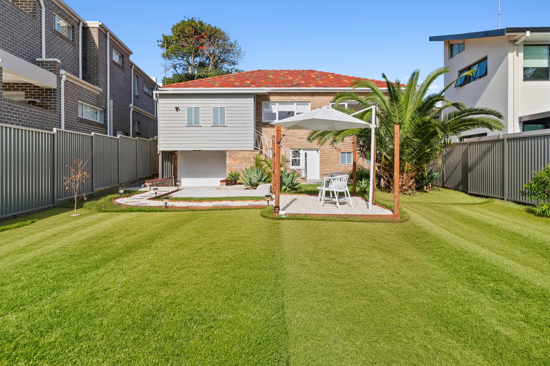 The backyard tells the rest of the story. Five hundred square metres of flat lawn, a timber pergola with an umbrella and outdoor dining, landscaped garden beds with agave and succulents, a palm tree catching the afternoon breeze. Two streets from Malabar Beach. Walking distance to Matraville shops and Matraville Public School. The kind of block that new builds on either side of the fence would pay a premium to sit on. With Goldpac's staging and photography, the listing now shows that block — and the home on it — at its absolute best.