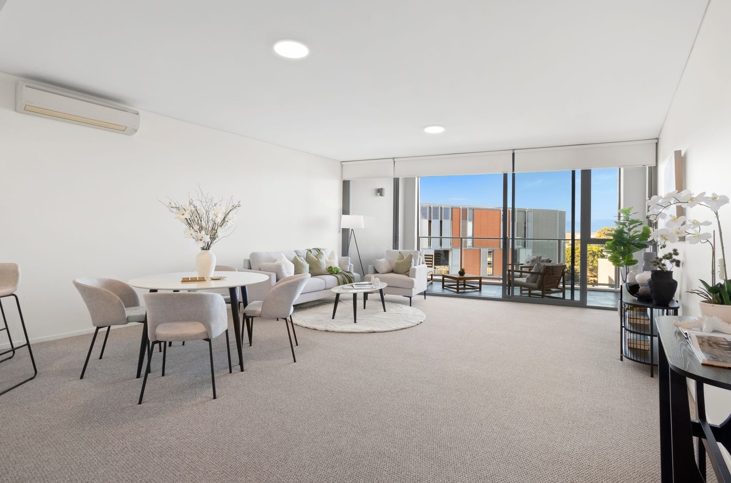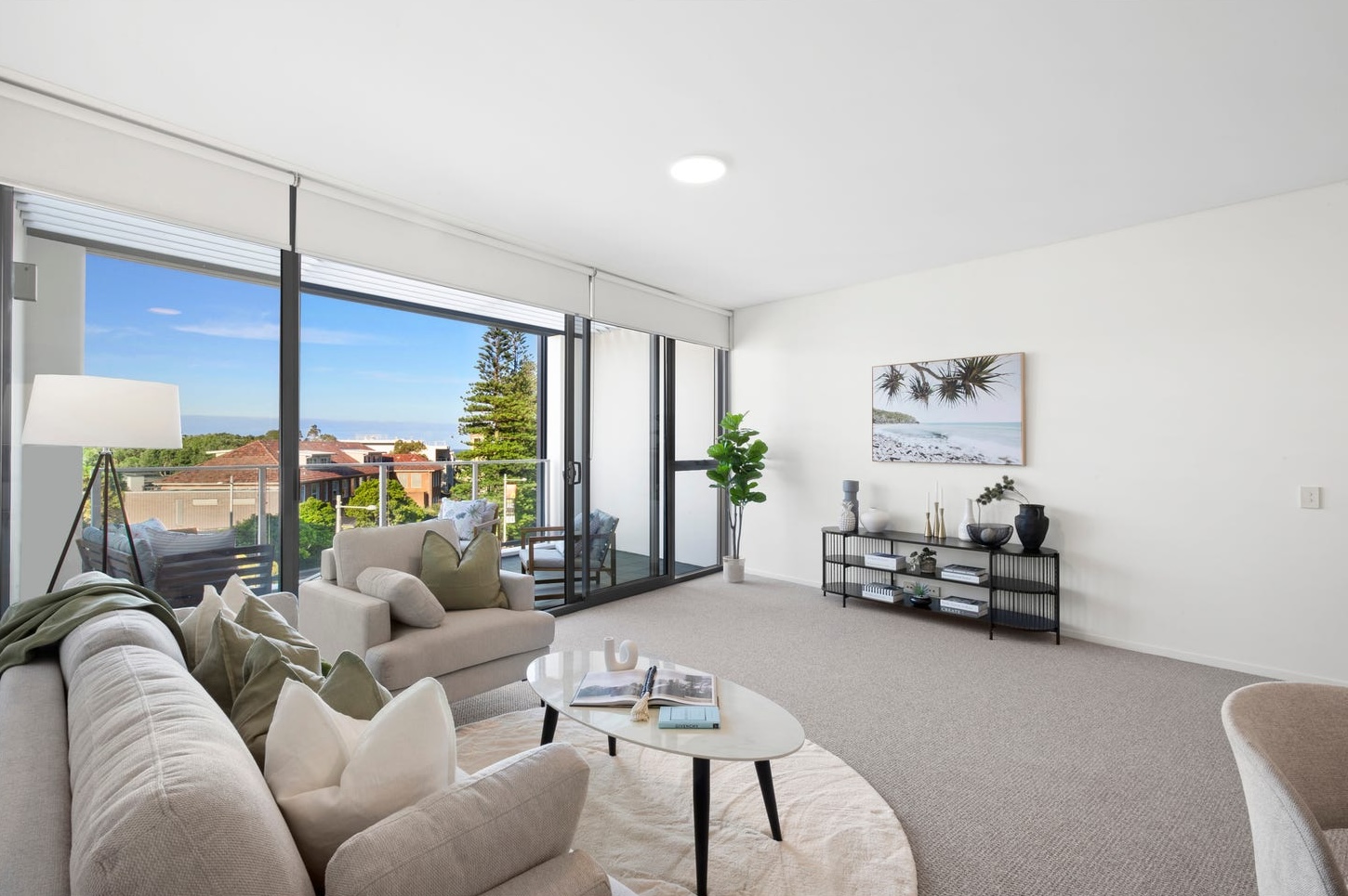 The living room was the first problem to solve. The space is wider than standard for Little Bay apartments — the listing copy says it and the floor plan confirms it — but width without furniture reads as emptiness. Buyers cannot tell a generous room from a vacant one when every wall is white and the only visual anchor is a power point. A low-profile cream sofa and matching armchair were placed to face the balcony, not the wall. The sight line ran clean from the entry through to the ocean. An oval coffee table — not rectangular — kept the centre of the room open without making it feel hollow. A round ivory rug underneath defined the living zone on carpet that otherwise had no boundary. The furniture said: this is where you sit. This is what you see. This is your life here.