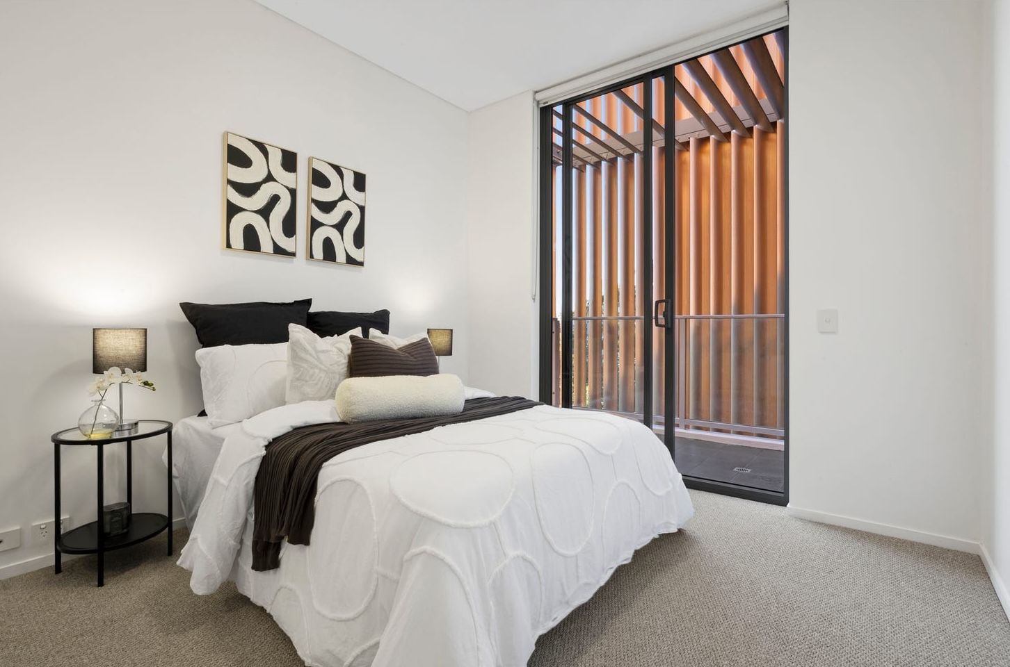 The bedrooms were staged to scale. Both larger than standard, both with built-in robes and balcony access. The master carried the coastal palette forward — soft linen tones, layered cushions, a bedside lamp that grounded the space. The second bedroom read as a guest room, not a spare room. Each was photographed with the balcony visible through the glass, tying every frame back to the view.