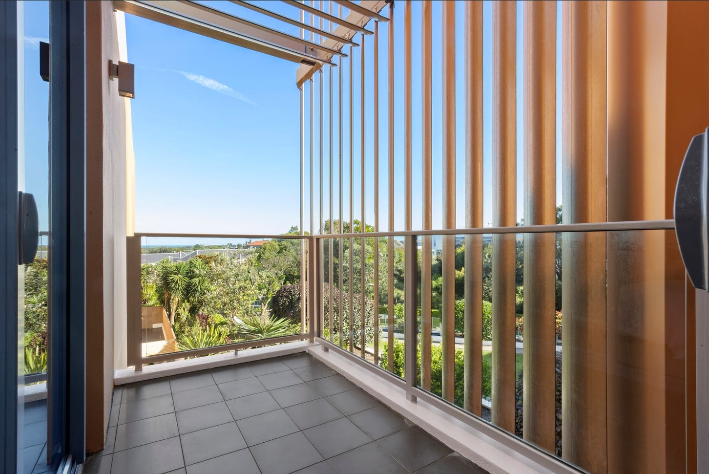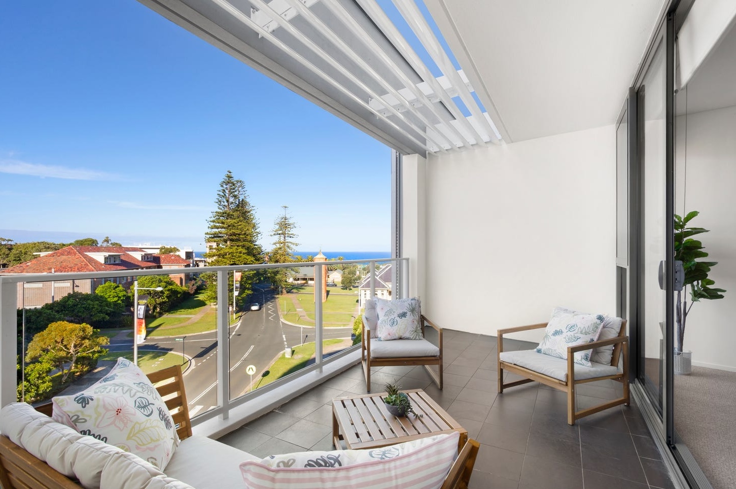 The covered balcony completed the story. Timber outdoor furniture — a two-seater with cream cushions and two armchairs with botanical-print scatter cushions — arranged around a slatted coffee table with a single succulent pot. A fiddle leaf fig in the corner. The louvered pergola overhead filtered the afternoon light. The ocean sat in the background, Norfolk pines framing the horizon. The balcony photographed as a second living room — because it was styled as one. In a suburb where buyers pay for the coast, showing them a bare concrete balcony with a glass rail is giving away the best asset for free.