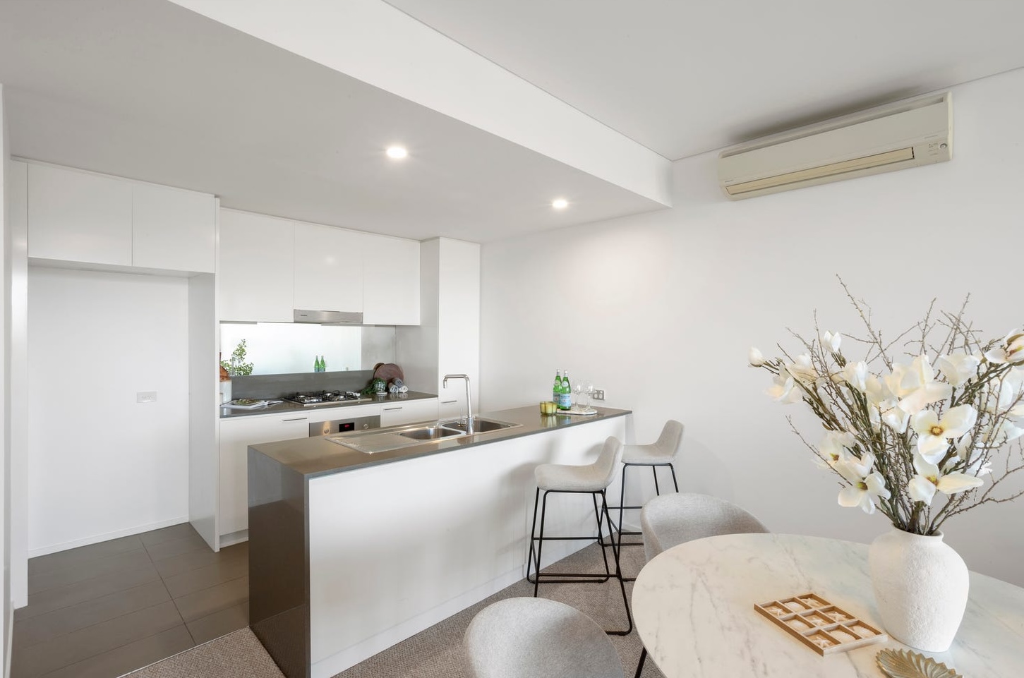 The dining zone anchored the opposite end of the open plan. A white round table with four upholstered chairs in soft taupe fabric, black metal legs matching the shelf unit across the room. White orchids in a tall vase on the entry console. The palette across both zones — cream, sage green, natural timber, sandy neutrals — ran coastal without being themed. There were no anchors, no rope, no shells. Just the colours of the place itself. A buyer scrolling at night would not think "staged." They would think "home."