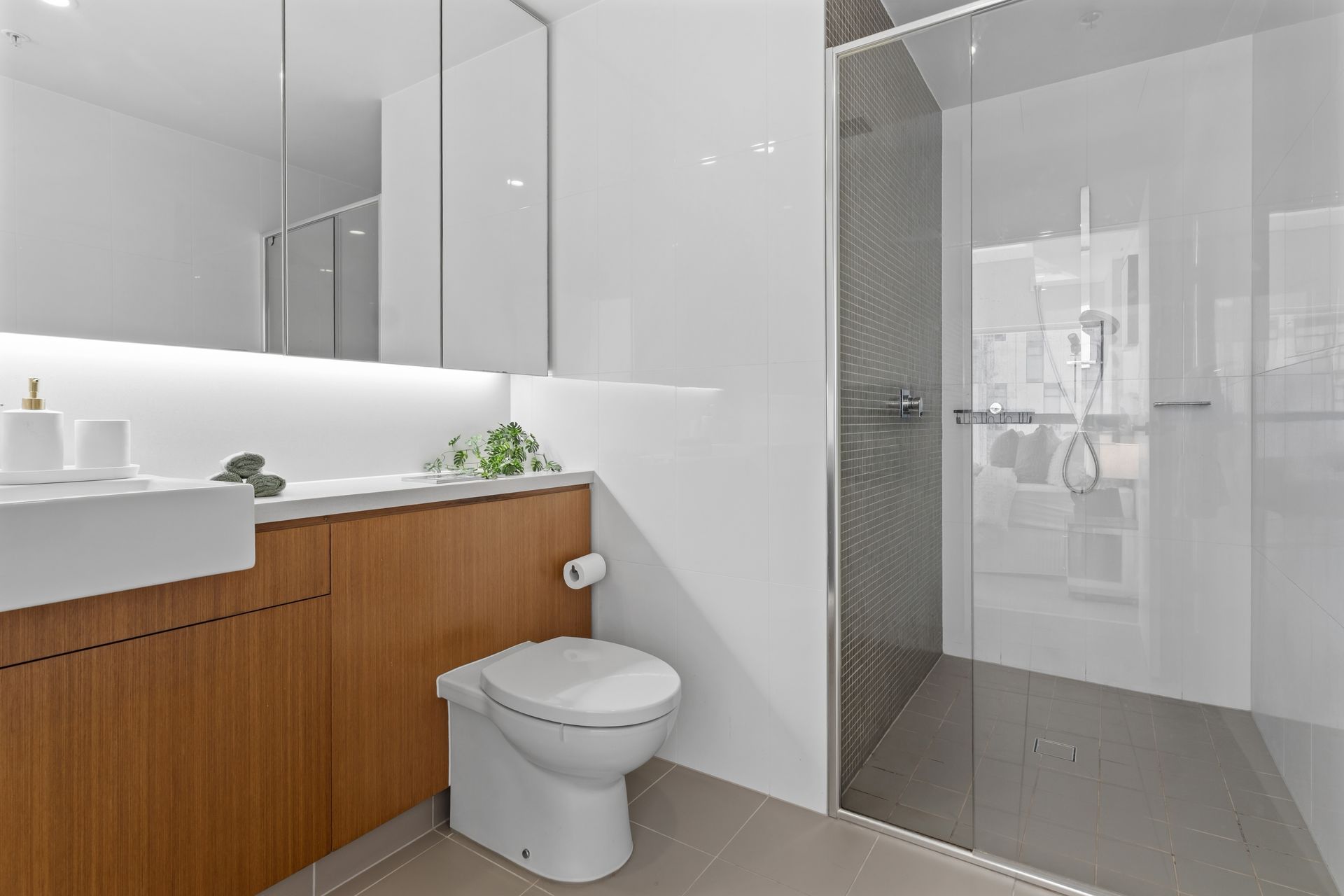 The master bedroom stepped into a different register entirely. Where the living room worked in monochrome — black, cream, sand — the master shifted to sage. A curved upholstered headboard in natural linen anchored the bed, dressed in white textured coverlet with mint-toned cushions and a fringed throw. Twin mirrored bedside tables caught the afternoon light and scattered it back across the room. A faux olive tree stood by the full-height window, its shape echoing the parkland visible in the distance. The palette was not random. It was pulled directly from the view — the greens of the suburban canopy below, the pale sky above, the warm light that moved across the floor through the afternoon. A buyer standing in that doorway was not looking at a bedroom. They were looking at a room that belonged to the landscape outside.