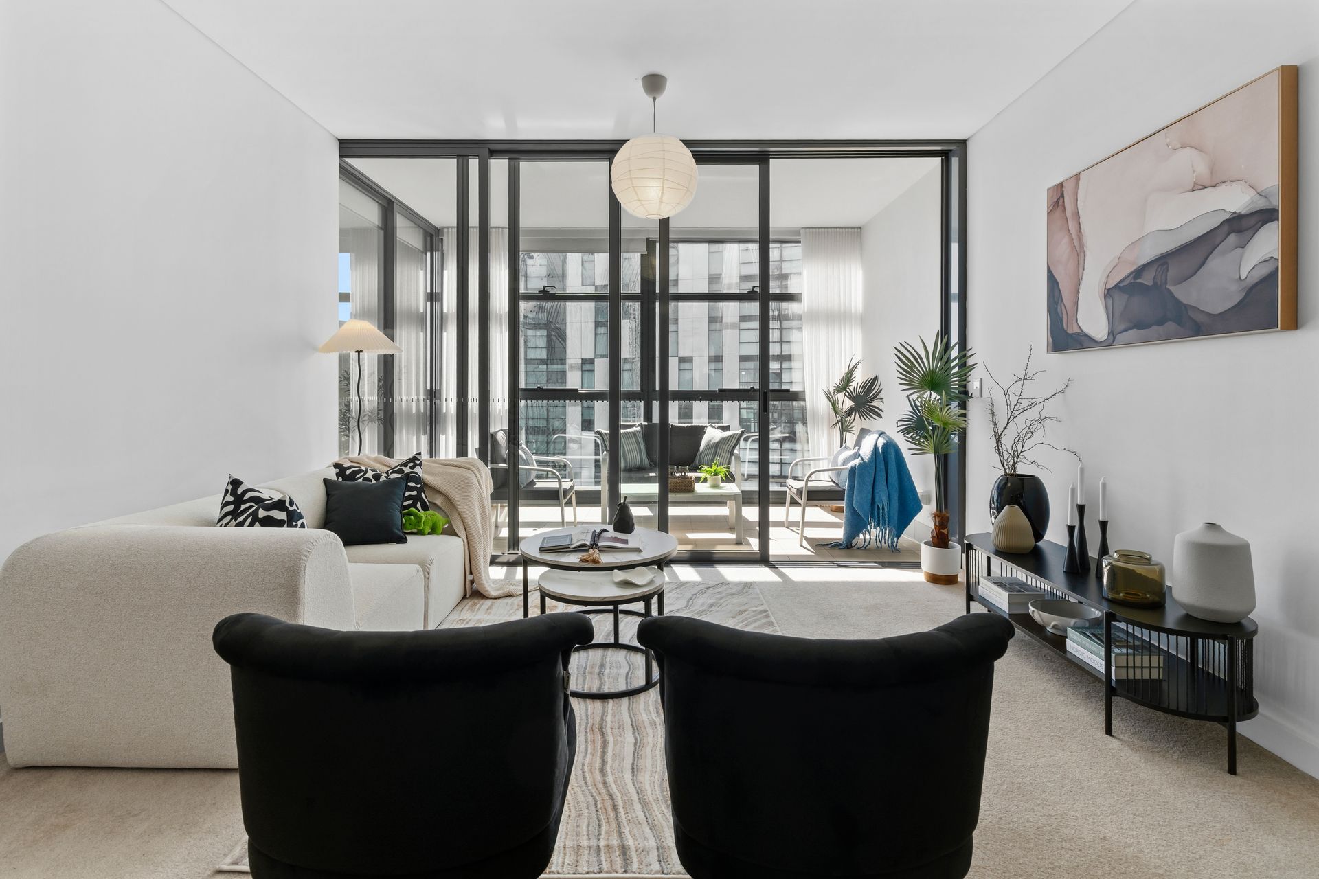 The black low-profile console along the right wall carried a curated shelf of ceramic vases — matte black, ribbed ivory, a dark glass piece with an amber tone — alongside a pair of tapered candle holders and a small stack of design books. Above it, a single abstract watercolour in blush and storm-grey tones. That painting did two things: it introduced colour without shouting, and it gave the wall a focal point that pulled the room together without competing with the view. In home staging Sydney apartments, this is the line between a furnished room and a designed space — one object that earns its position.