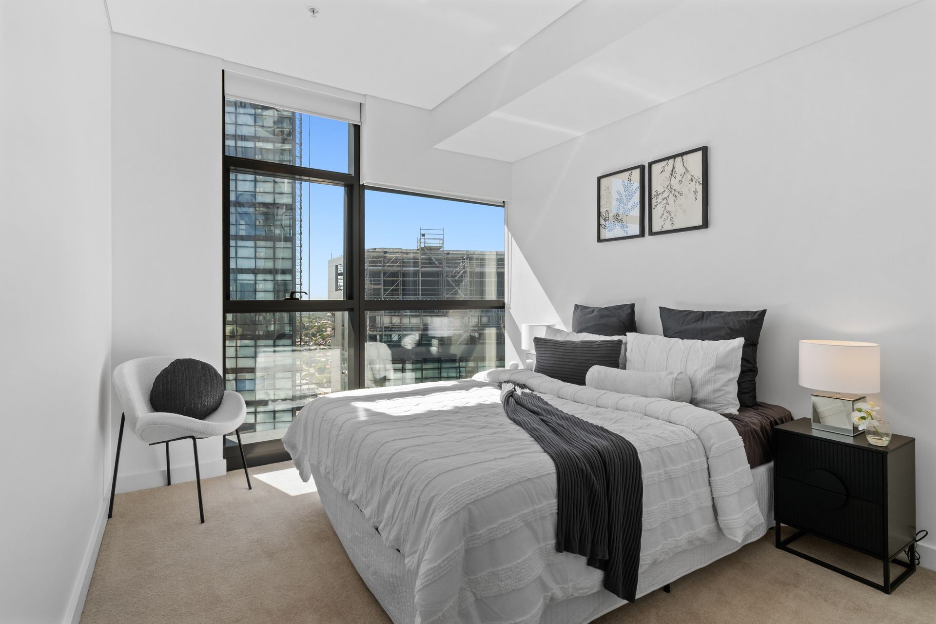 The second bedroom took the opposite approach. Charcoal and grey layered bedding, a black bedside table, a white boucle accent chair in the corner with a single dark round cushion. Two framed botanical prints hung above the headboard — delicate, blue-toned, deliberately quiet. This room was not trying to impress. It was trying to feel settled. The contrast with the master was intentional: two bedrooms, two moods, two reasons a buyer would walk through and think this apartment has been thought about.
