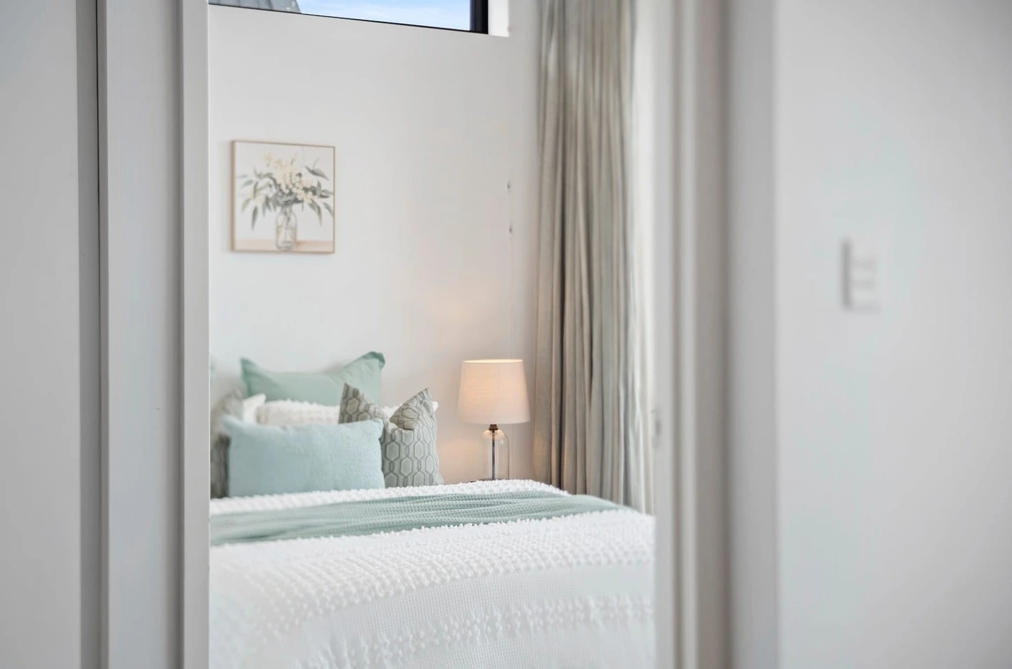 In the bedroom, styling focused on comfort and flow. Textiles in soft whites and muted greens connected the interior to the balcony outlook, reinforcing the indoor–outdoor lifestyle so important in Camperdown. The room felt calm, generous, and private — not like a compromise.