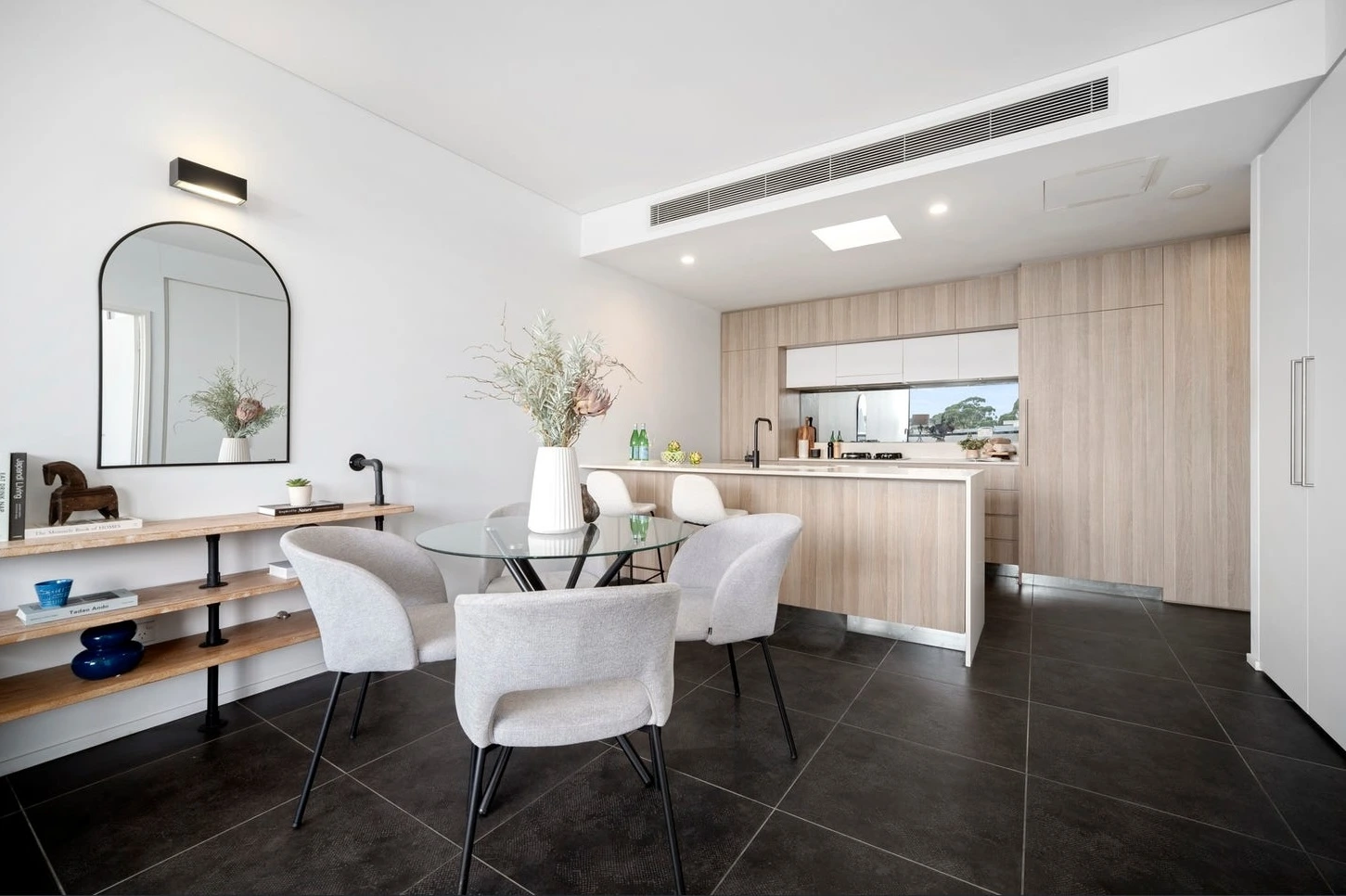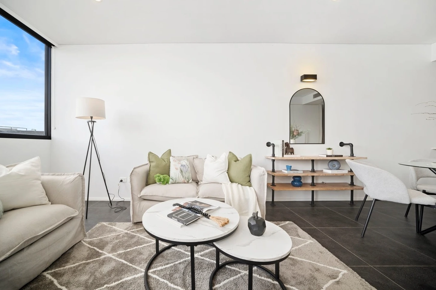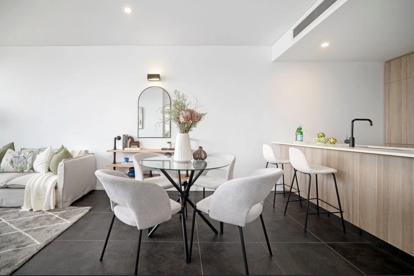 In the living zone, we created a calm, sun-filled narrative using soft neutrals, curved furniture, and layered textures that visually softened the tiled floors and echoed the north-facing light. The seating layout clearly defined the lounge without shrinking the space, allowing buyers to instantly understand how the room works day-to-day.