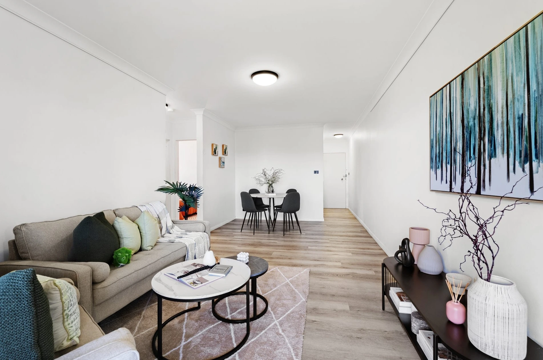 In the dining area, we avoided the heavy rectangular table that screams “tight”. The round dining setting keeps the room moving and makes the space feel effortless — exactly what first-home buyers and investors want: low friction.