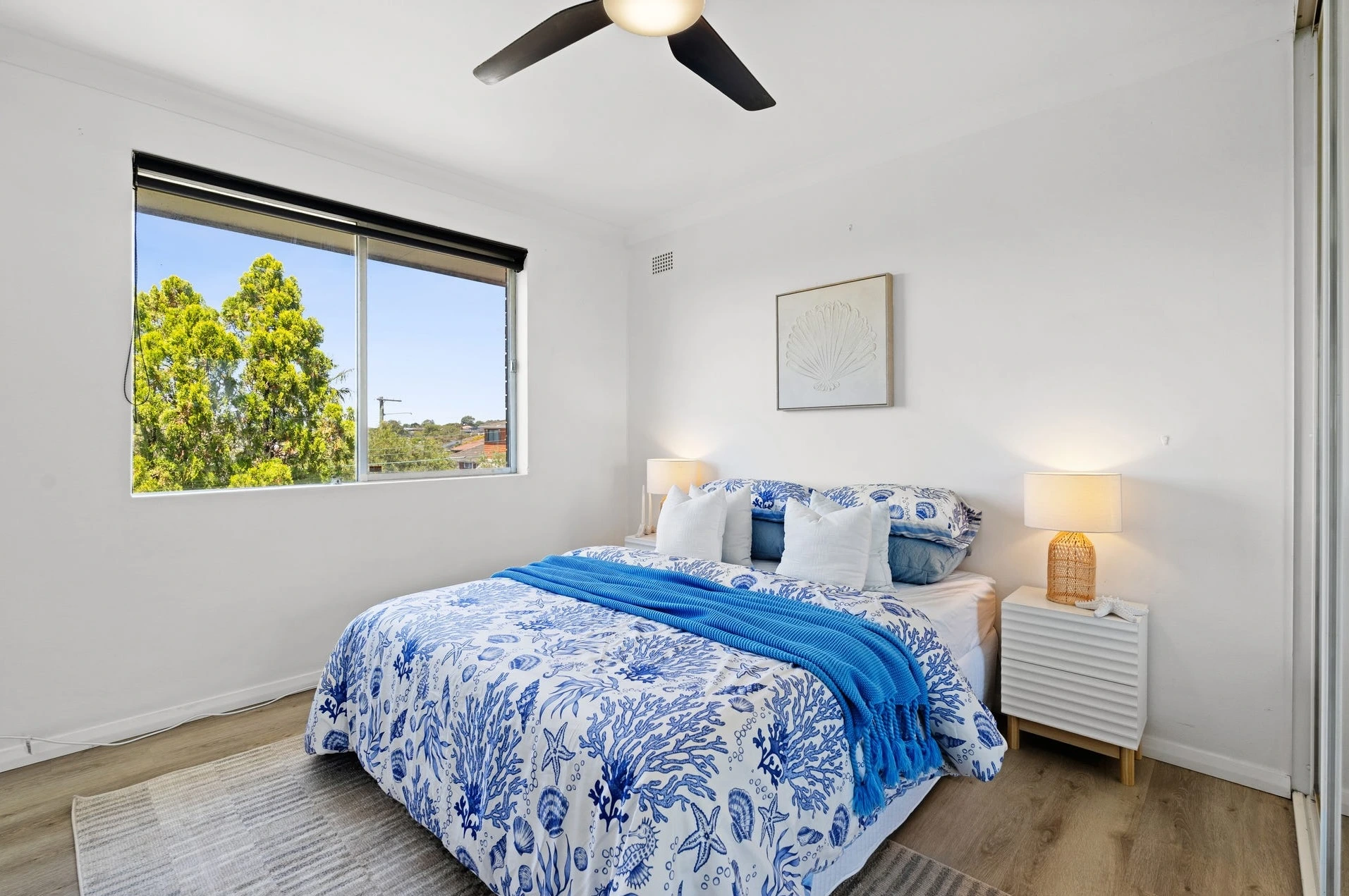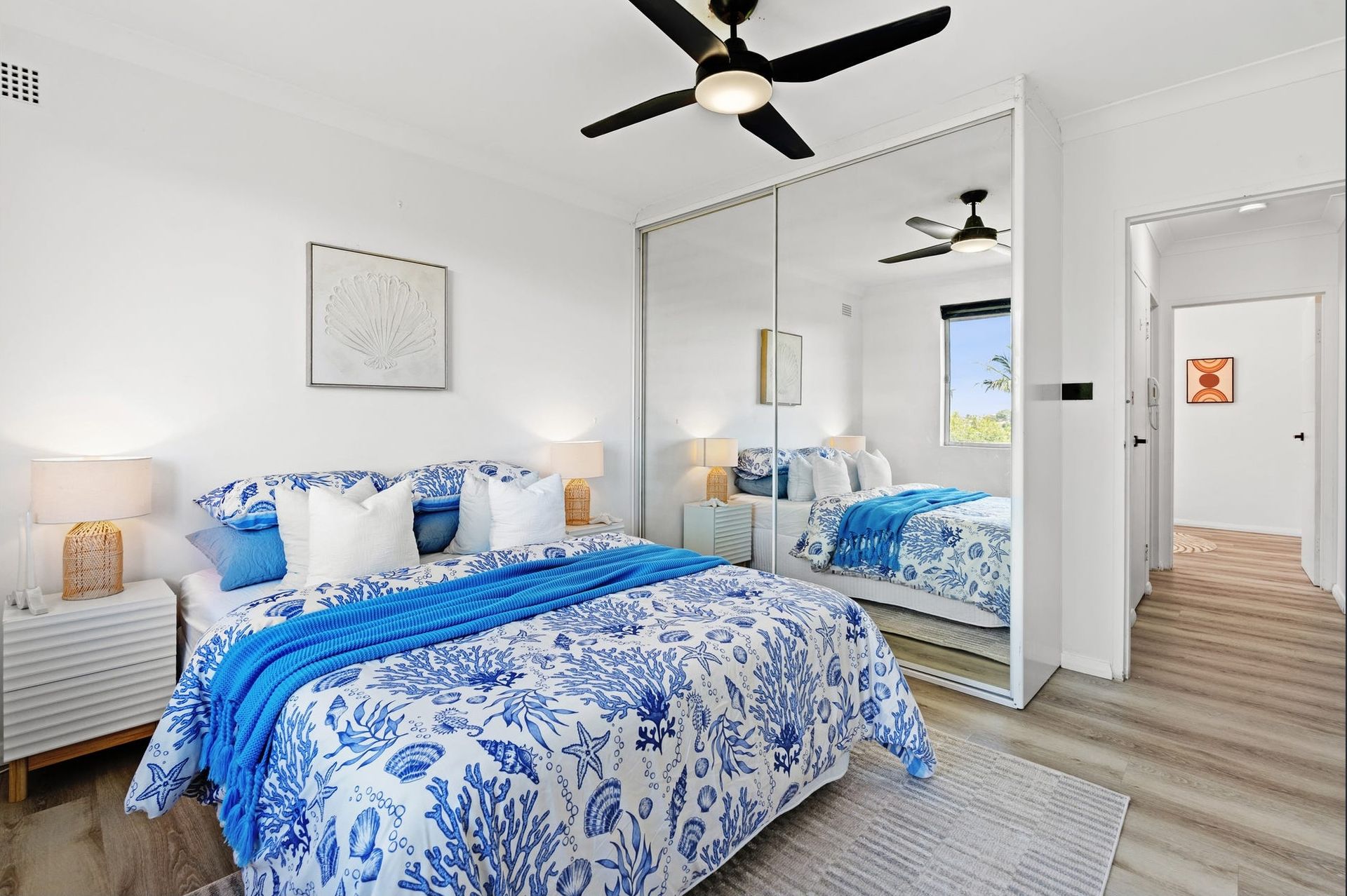 Bedrooms were styled with two moods: one crisp and coastal (fresh, bright, move-in ready), the other warm and grounded (comfortable, easy to imagine as a guest room or home office). It quietly broadens buyer appeal without saying it out loud.