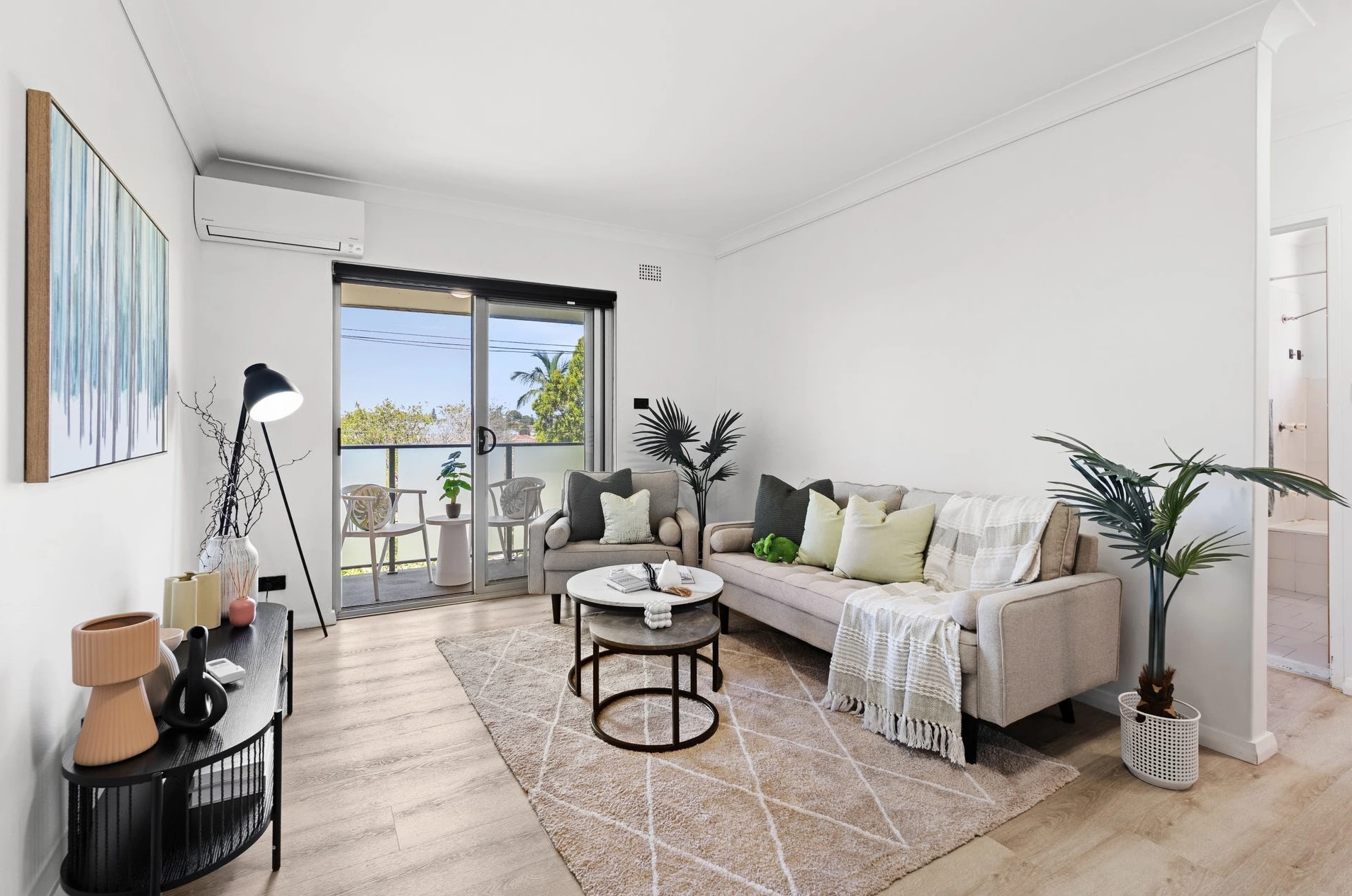 In the living zone, we used a soft neutral sofa and armchair that sit light on the floor, with rounded nesting coffee tables that don’t visually block the centre. The rug anchors the space (so it reads as a living room, not a hallway), while plants pull the balcony greenery into the photos.