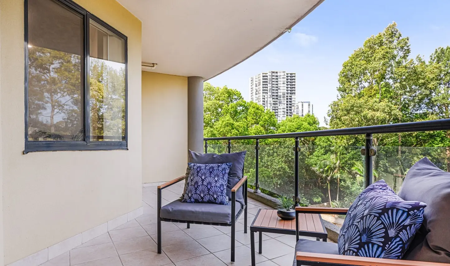 Out on the balcony, we resisted clutter and told a single, clear lifestyle message: morning coffee above the gum trees before a quick dip in the complex pool. A charcoal outdoor set with patterned cobalt cushions framed the treetops and softened the gentle curve of the balustrade. It reads private, leafy and relaxed—exactly what buyers want after a Parramatta-CBD workday.