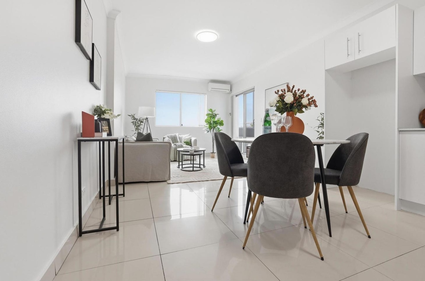 Without staging, the living room and dining zone merged into a single corridor of tile. The eye had nowhere to rest and nowhere to land. The enclosed balcony — a legitimate point of difference in a suburb where outdoor space is limited — could easily photograph as a concrete utility room with a pergola roof. The bedroom, bright and quiet with its mirrored wardrobe and open ceiling, would have registered as a white box with a window.