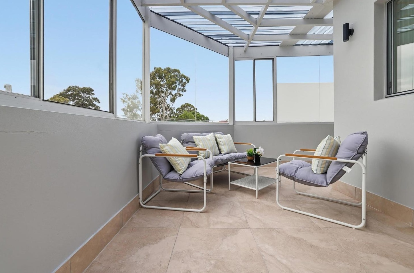 The enclosed balcony was styled with white metal outdoor furniture — a two-seater and armchair with deep grey cushions and yellow-green stripe accent pillows. A small black side table, an orchid in a pot. The polycarbonate pergola roof filters the light softly. Eucalyptus canopy visible through the side panels. This space is now a second living zone in the listing photos, not an afterthought.