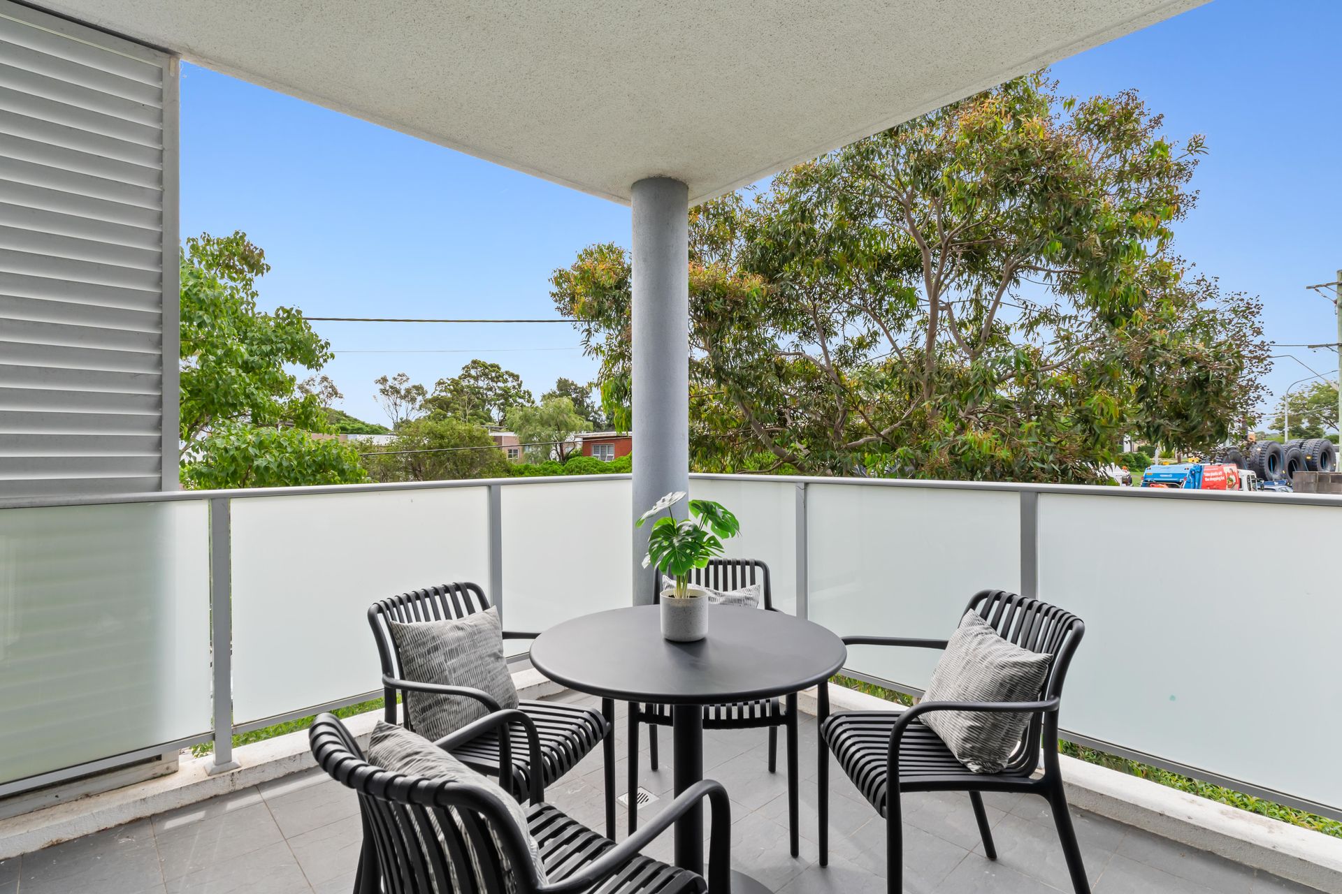 The balcony — generous, covered, overlooking mature eucalypts along Adderton Road — received a black slatted outdoor dining set and a monstera plant. It read as a second living space, not an afterthought.