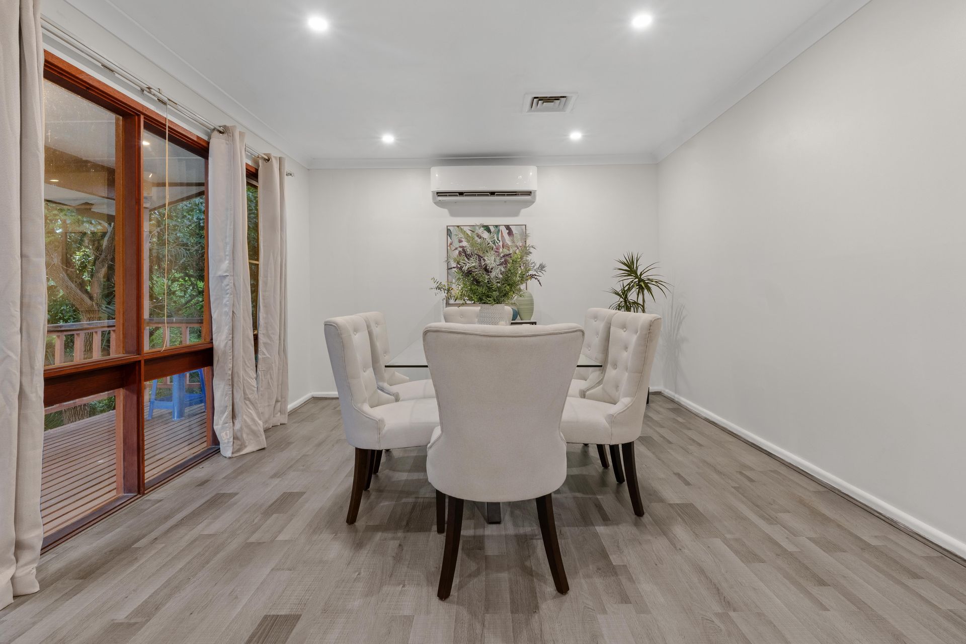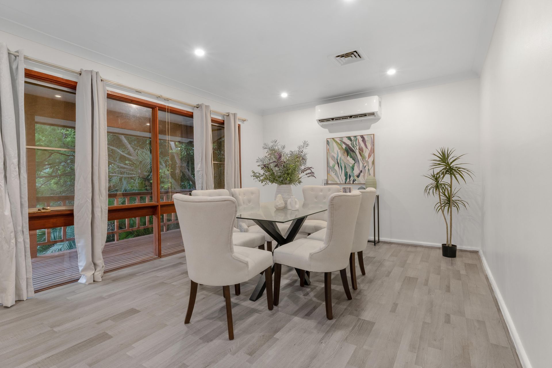 The dining room was the hardest room. Floor-to-ceiling burnt-orange timber sliders, a wall-mounted split system, and not much else. A glass-top table on a dark geometric base let the timber breathe through the room. Six cream tufted dining chairs gave the space weight without blocking the view to the deck. A single dracaena in the corner picked up the green from outside the window. Three deliberate choices, no clutter, no competition.