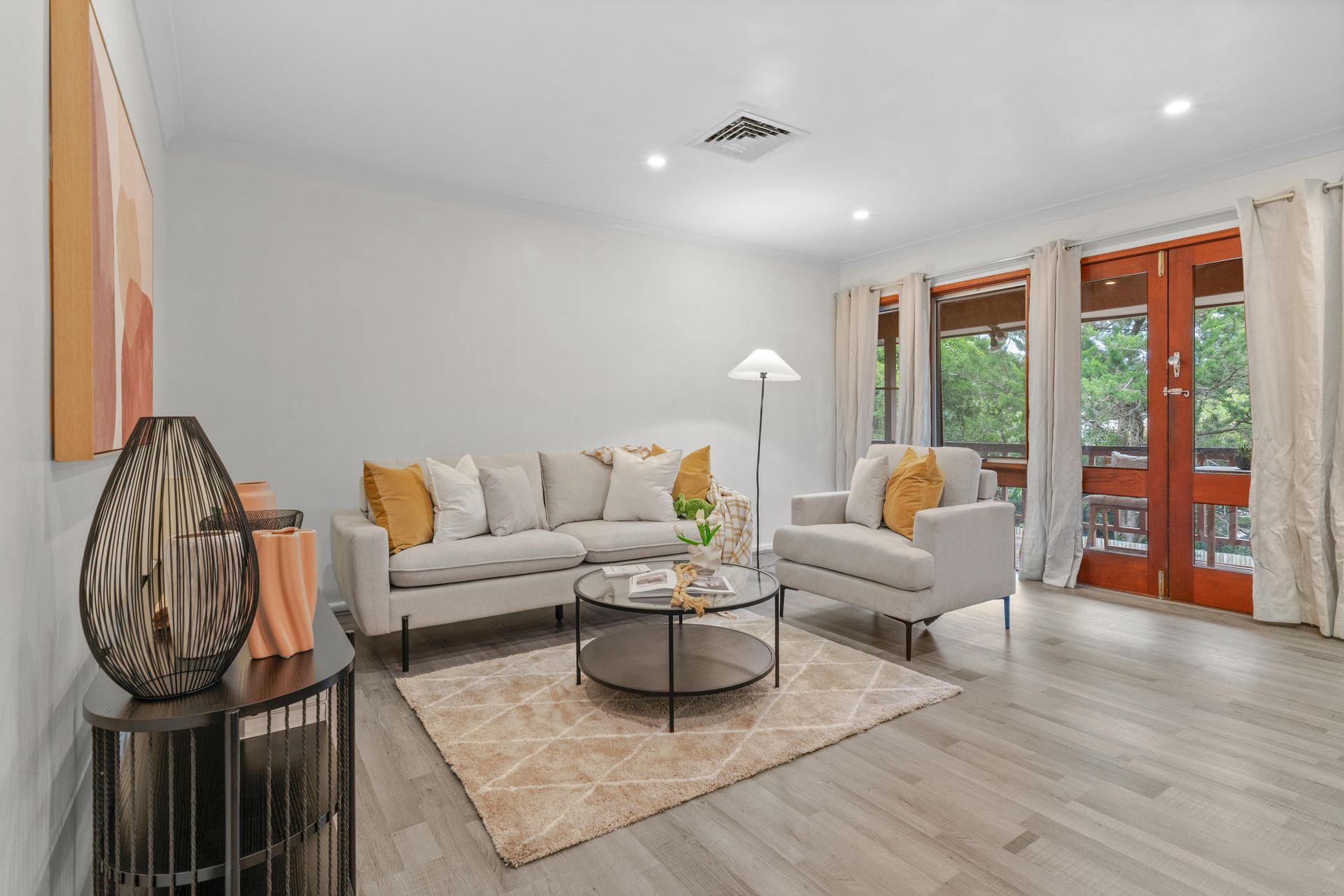 The styling brief was specific before a single piece of furniture came through the door. The timber could not be fought — it was the architecture of the house. So the styling had to befriend it. The living room got a pale dove-grey sectional and a cream armchair with mustard cushions — a palette pulled directly from the terracotta abstract on the wall, which was chosen to echo the orange window frames rather than hide them. A black spindle console table grounded the room without competing with the timber doorway out to the deck. The round black coffee table kept the sight line open through to the trees. Without staging, that living room would have read as a wide, empty box with confusing colour temperature. Styled, it read as warm, considered, intentional.