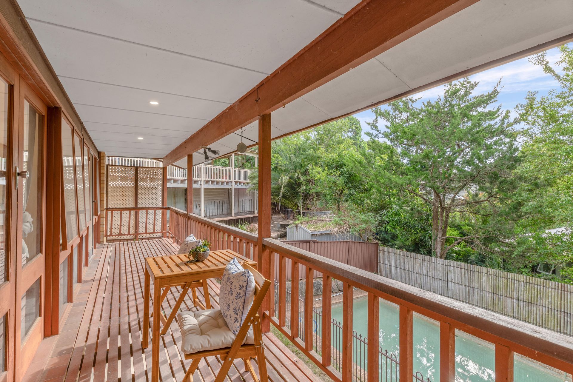 Outside, the upper deck got a small timber bistro setting for two — just enough to show the deck was a usable, lingering space, not a walkway. From that chair, the camera could see the pool below through the iron fence, the sandstone wall, the eucalypts, the sky. One frame told the entire outdoor story.