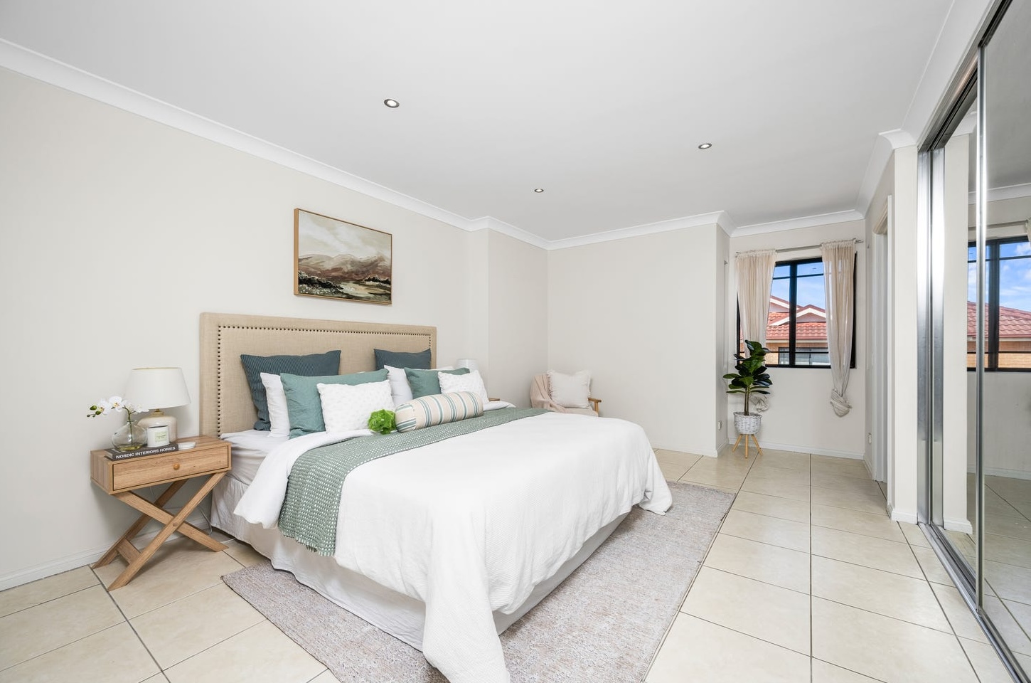 Upstairs, the master bedroom was given a sage and teal palette: a linen upholstered headboard, layered white and green bedding, timber cross-leg bedside tables, a single orchid. Quiet and considered. The kind of room a buyer photographs at the inspection before they've made a decision.