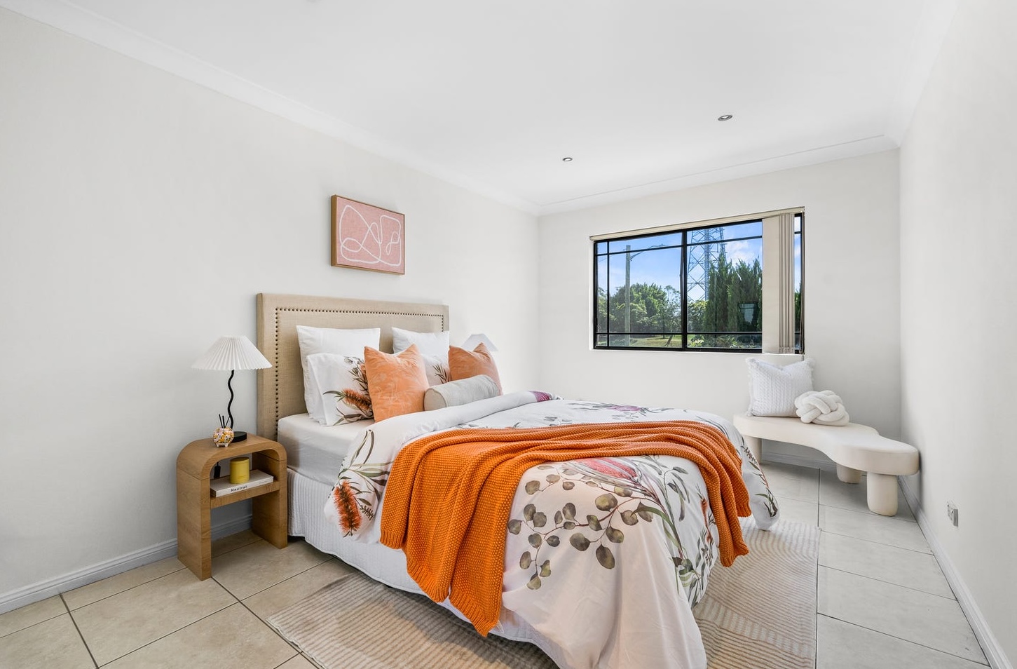 The second bedroom answered a different question. A botanica-print duvet in native florals, an orange wool throw, terracotta cushions, an arched timber bedside. Specific enough to feel like a real space for a real person — not a filler room that buyers mentally convert into storage.