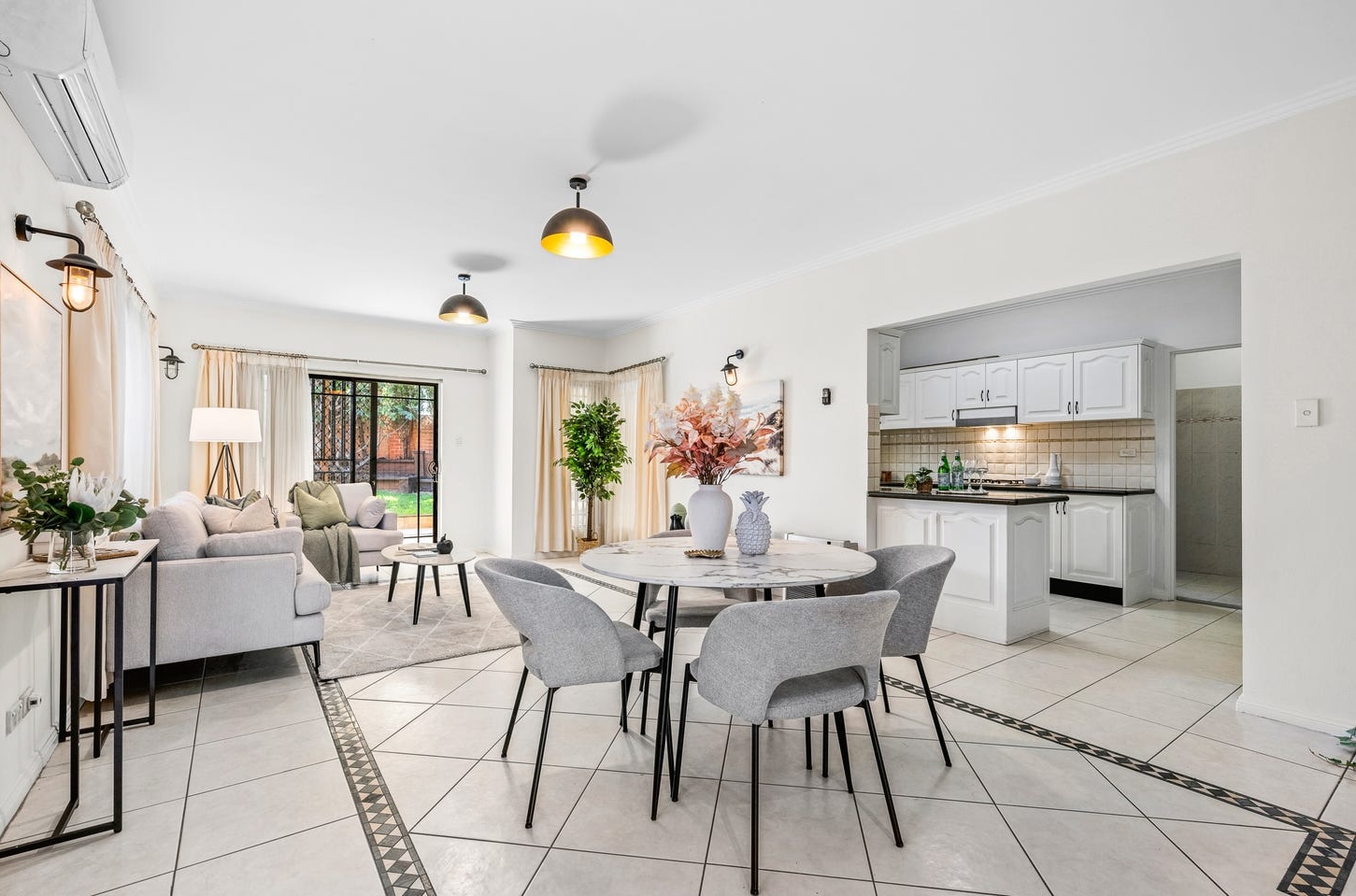 The living room had the bones for it — what it needed was a point of view. A low-profile grey sectional sofa was positioned to open the sight line from the front of the room directly through to the sliding glass door and the garden beyond. The round marble-top dining table was anchored under one of the black dome pendant lights — a deliberate compositional move that reframed the tile border below as a period detail worth keeping rather than one to apologise for. Wall-mounted industrial lantern sconces, paired with the pendants, added warmth to a room that needed it. Cream curtains, floor-length and light-diffusing, softened the perimeter without closing the space. A ficus in a wicker basket near the garden slider finished the indoor-outdoor story before buyers even stepped outside.