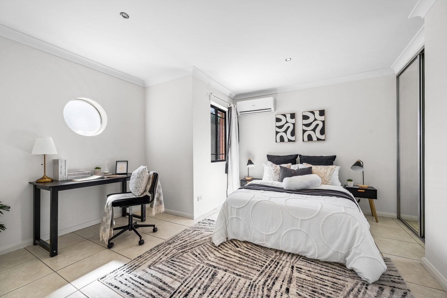 The third bedroom is where Goldpac made the decision that mattered most. The room had a round porthole window, high on the wall — an architectural quirk that reads either as charming or as strange, depending entirely on how the room is presented. The call: style it as a study-bedroom hybrid. A black timber desk was positioned beneath the porthole, a pair of monochrome abstract prints hung above the bed, a bold geometric rug anchored the floor. The porthole stopped being a question mark. It became a feature. At the second inspection, two separate buyers asked whether it was original or added. It was original. The staging made it worth asking about.