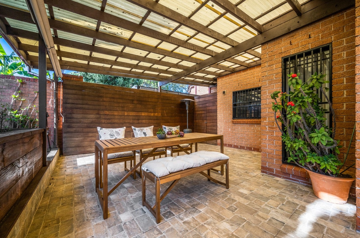 The alfresco was the last piece. A solid timber dining table with bench seating, succulent centrepiece, a gas heater positioned just off-centre. The covered pergola — with translucent corrugated panels letting afternoon light filter through — photographed as a year-round room rather than a seasonal afterthought.