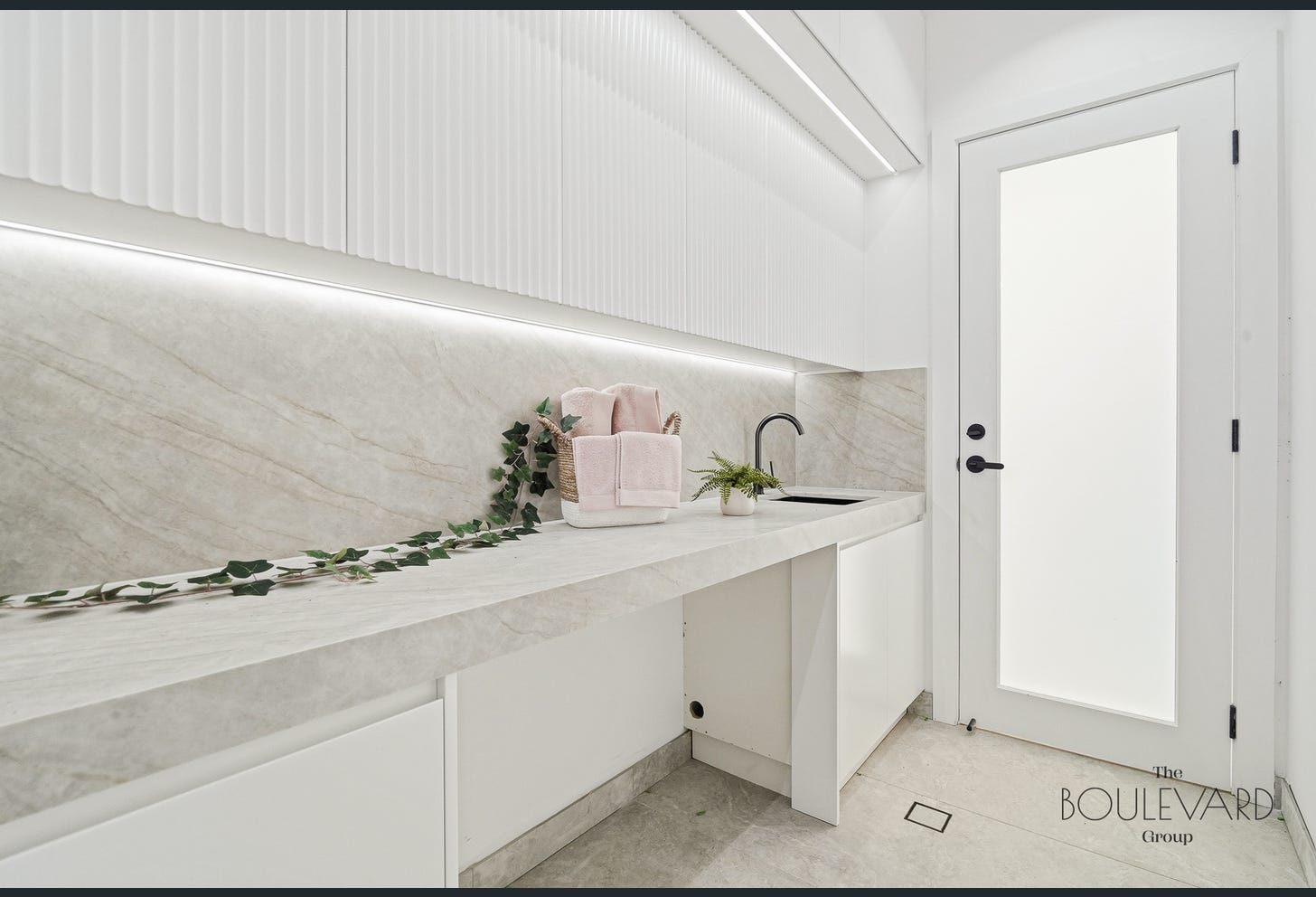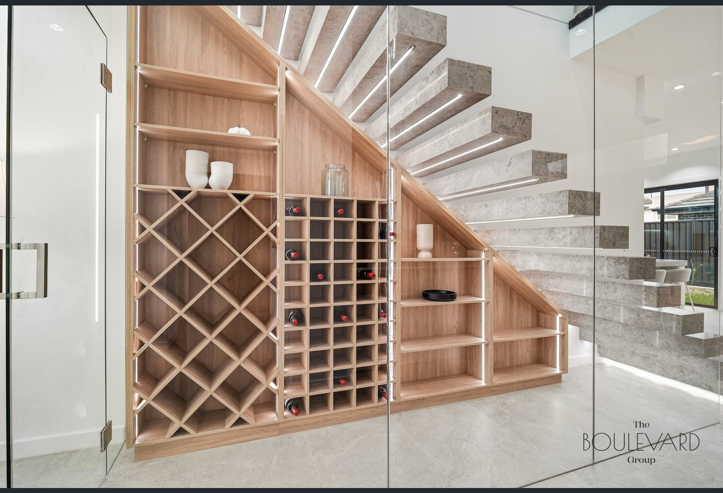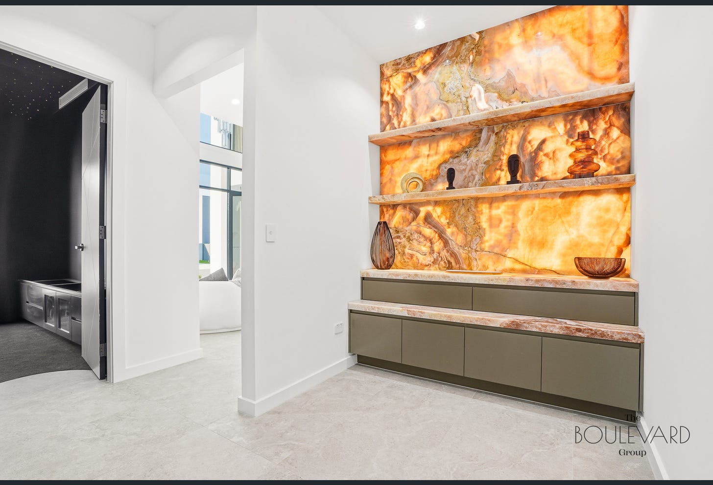 The home was finished. Every surface complete. Eighty-millimetre marble benchtops in the kitchen. A floating stone staircase with LED strip lighting under each tread. A wine cellar behind glass. A cinema room with a fibre-optic star ceiling. A backlit onyx feature wall that glowed amber through three floating shelves. A stone fireplace anchoring a living room under a four-and-a-half-metre void. Fluted panelling running from the kitchen island through the butler's pantry to the entry console. Herringbone oak on the entire upper level. Five bathrooms. A prayer room. A pool.
