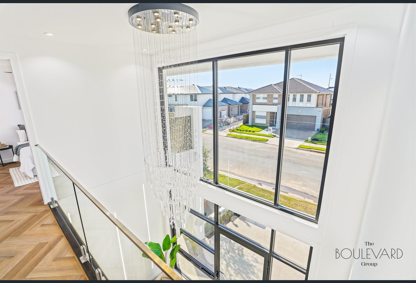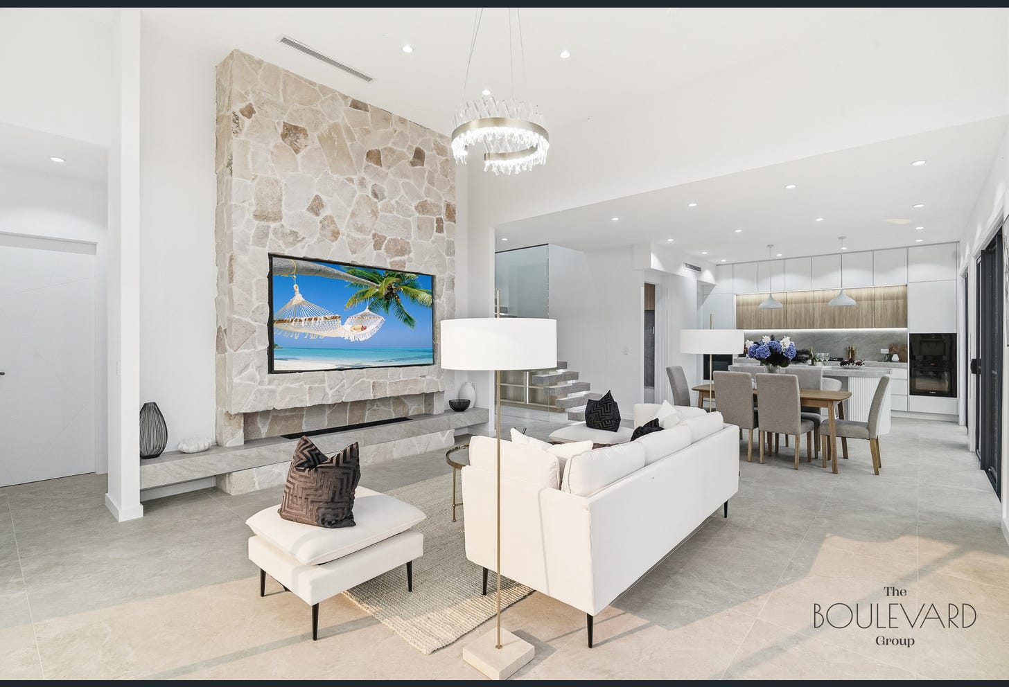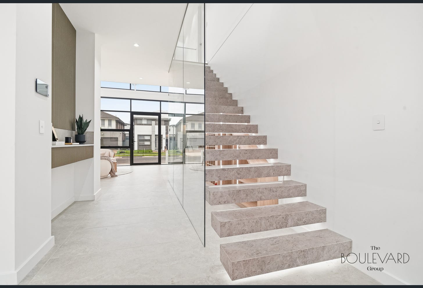 A six-bedroom modern Mediterranean on Zimeo Place, Marsden Park — where 4.5-metre ceilings, floating stone stairs, and a backlit onyx wall needed staging that could match the architecture without competing with it, and photography built to sell the warmth the marble alone could not.