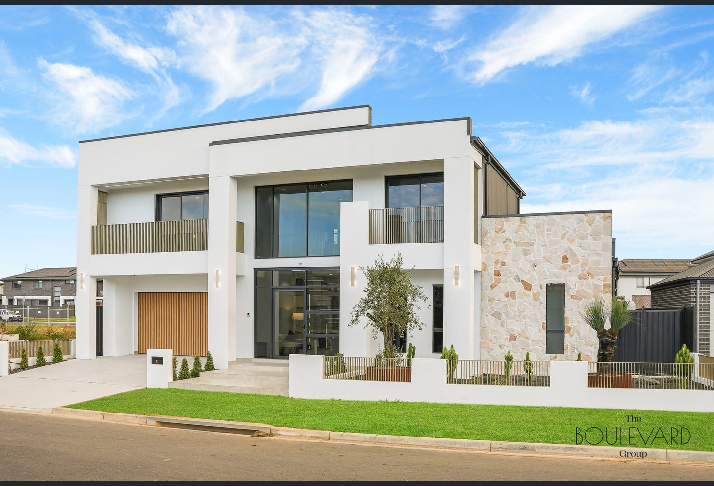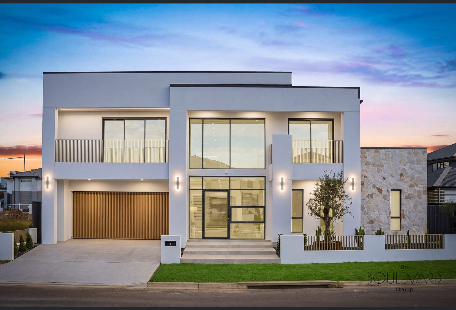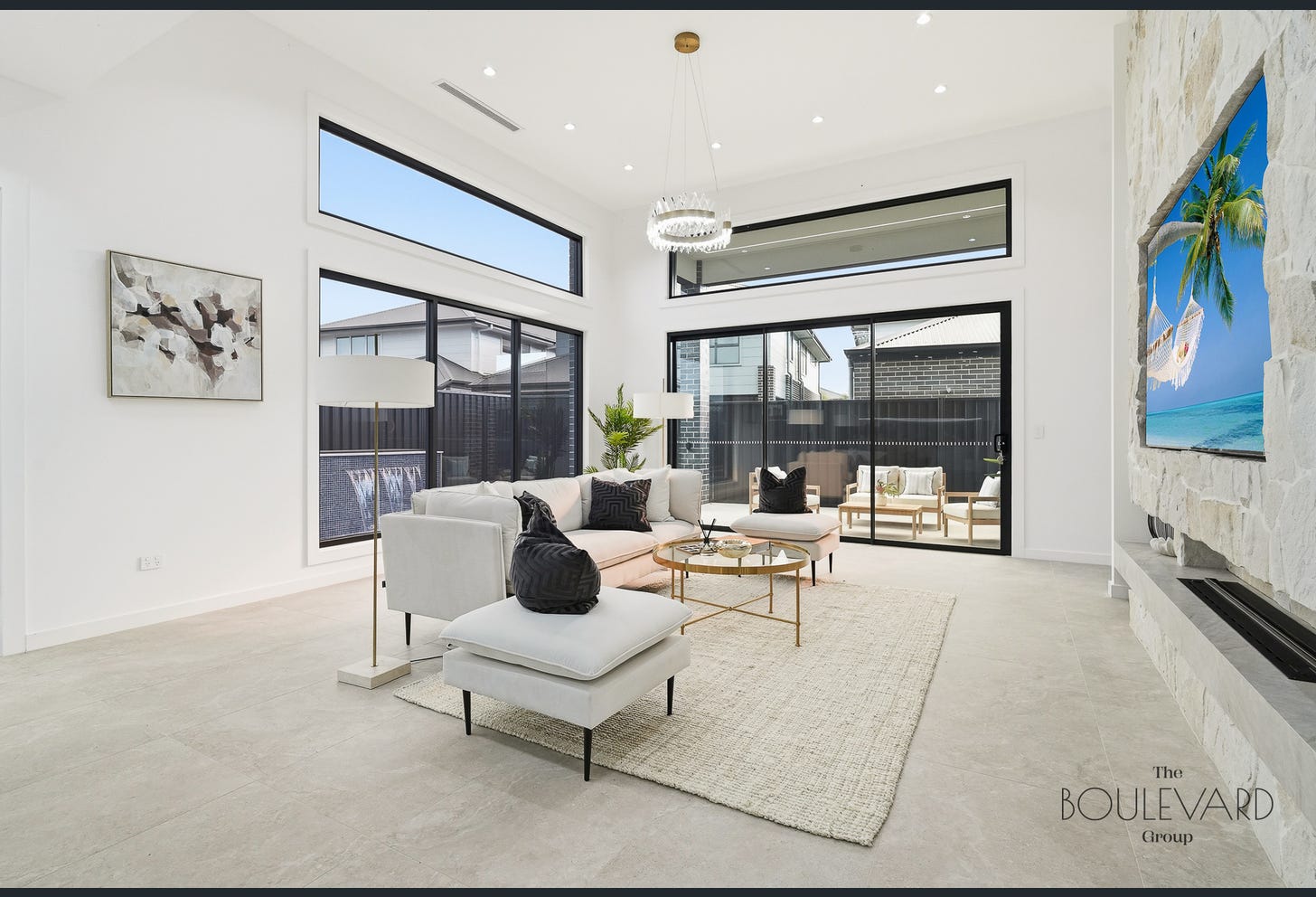 A six-bedroom modern Mediterranean on Zimeo Place, Marsden Park — where 4.5-metre ceilings, floating stone stairs, and a backlit onyx wall needed staging that could match the architecture without competing with it, and photography built to sell the warmth the marble alone could not.